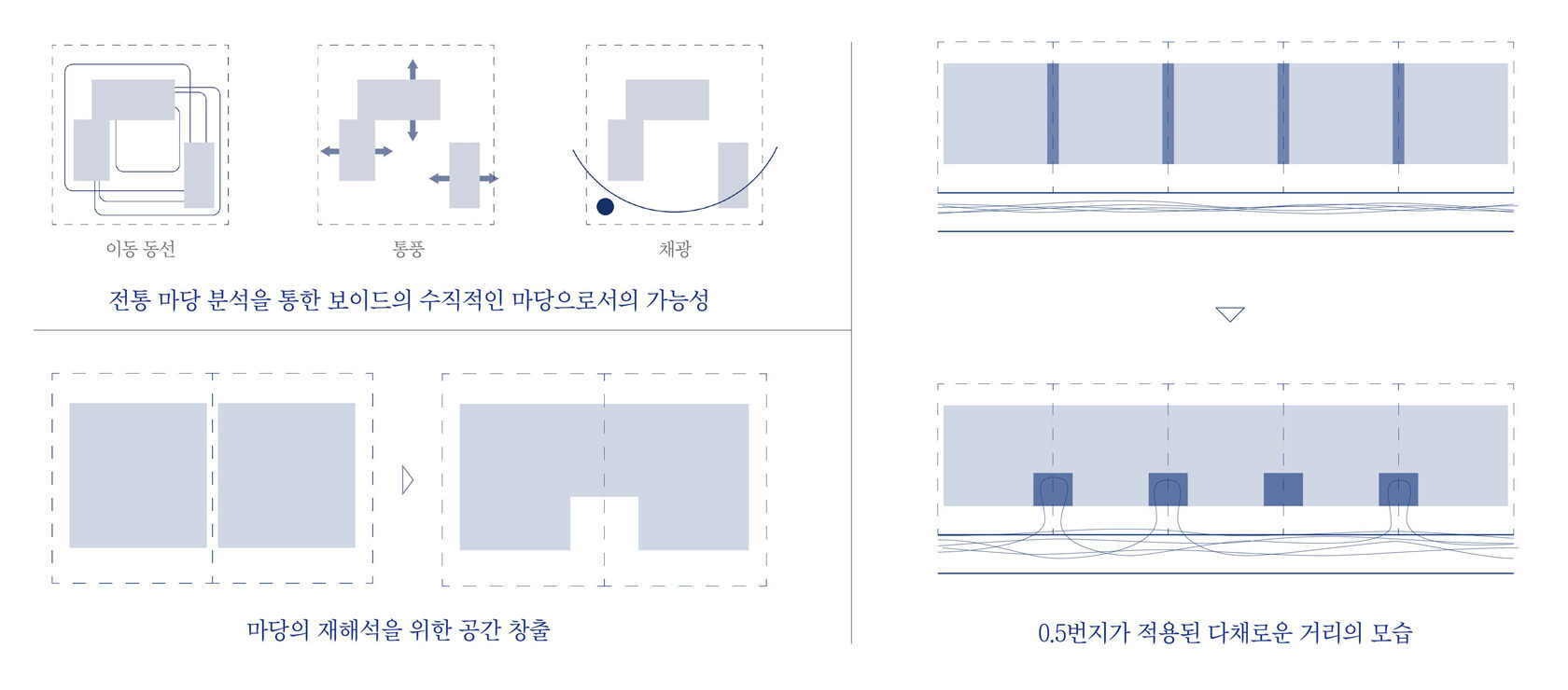 그렇다면, 본래 그곳에는 어떤 공간이 있었을까. 1980년대부터 본격적으로 시작된 빠른 도시화로 인해 생겨난 빌라와 상가 등의 건물들이 들어오기 전, 건물 매스와 빈 여유 공간(마당)의 조화로 구성되어 있던 대지는 건폐율을 비롯한 법률에 의해 간신히 틈새 공간으로만 남게 되었다. 우리는 이 틈새에 주목하였고, 마당이라는 공간을 재해석해보며 공간의 가능성을 찾으려 하였다.