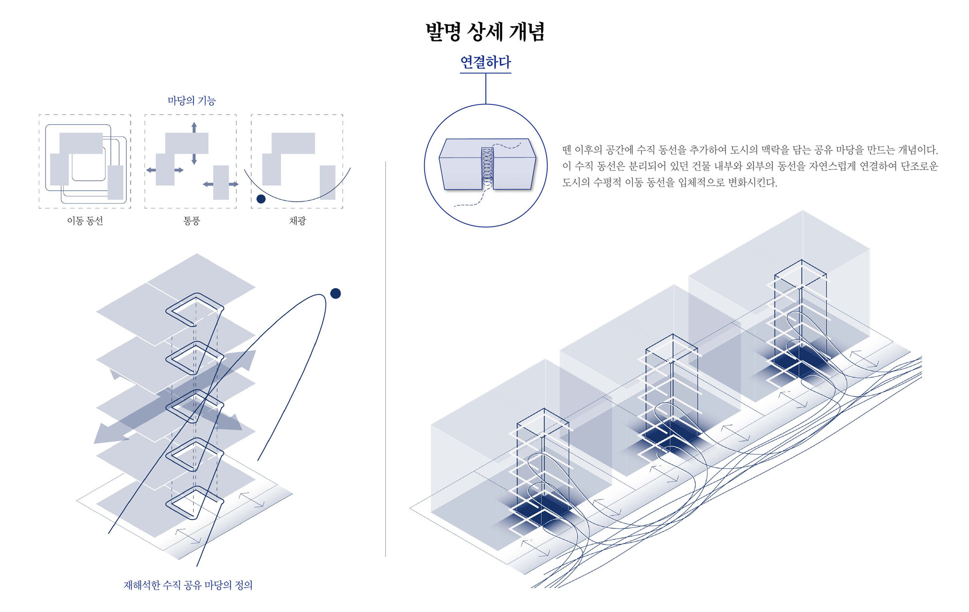 두 번째인 ‘연결하다’는 뗀 이후의 공간에 수직 동선을 추가하여 도시의 맥락을 담는 공유 마당을 만드는 개념이다. 이 수직 동선은 분리되어 있던 건물 내부와 외부의 동선을 자연스럽게 연결하여 단조로운 도시의 수평적 이동 동선을 입체적으로 변화시킨다.