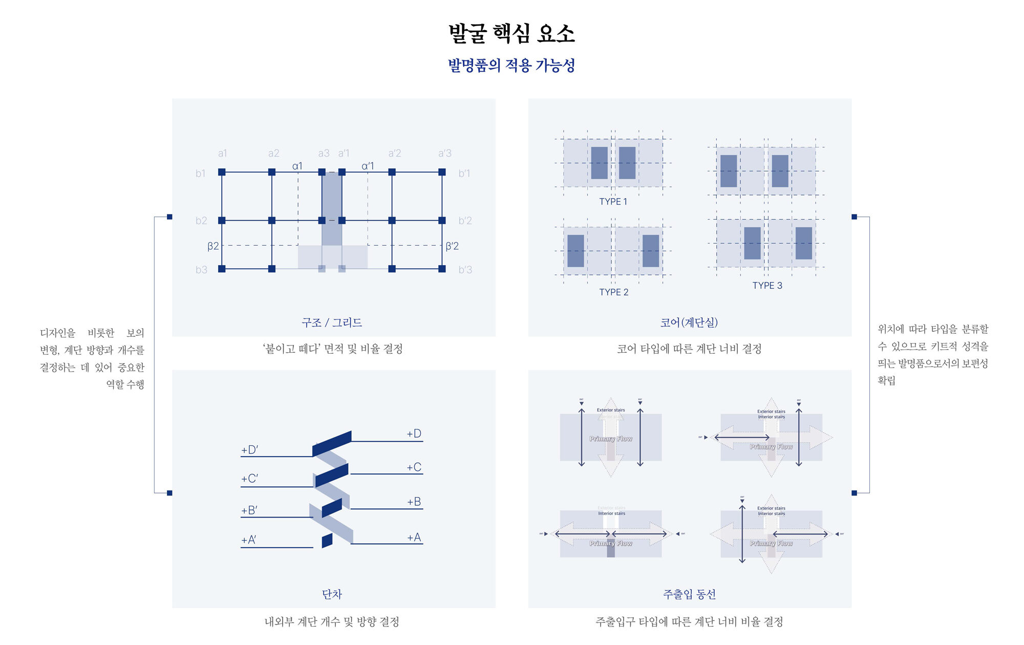 ‘붙이고 떼다 – 연결하다’라는 발명 단계를 가진 발명품을 여느 건물에나 적용하기 위해서는 건물 속에서 발굴해야 하는 요소 4가지가 있다. ‘구조/그리드, 단차, 코어 위치, 주출입 동선’의 네 가지 발굴 요소는 발명품을 적용하기 위해 건물에서 필수적으로 발굴해야하는 요소이며, 동일한 위계를 가진다. ‘구조/그리드’와 ‘단차’는 사이트마다 각기 다른 형태와 값을 갖기 때문에 디자인을 비롯한 보의 변형, 계단의 방향과 개수를 결정하는 데 있어 중요한 역할을 하는 발굴 요소이다. 더하여 ‘코어 위치’와 ‘주출입 동선’은 그 위치에 따라 유형을 나눌 수 있으므로 키트의 성격을 띠는 발명품으로서의 보편성과 기준을 확립한다.