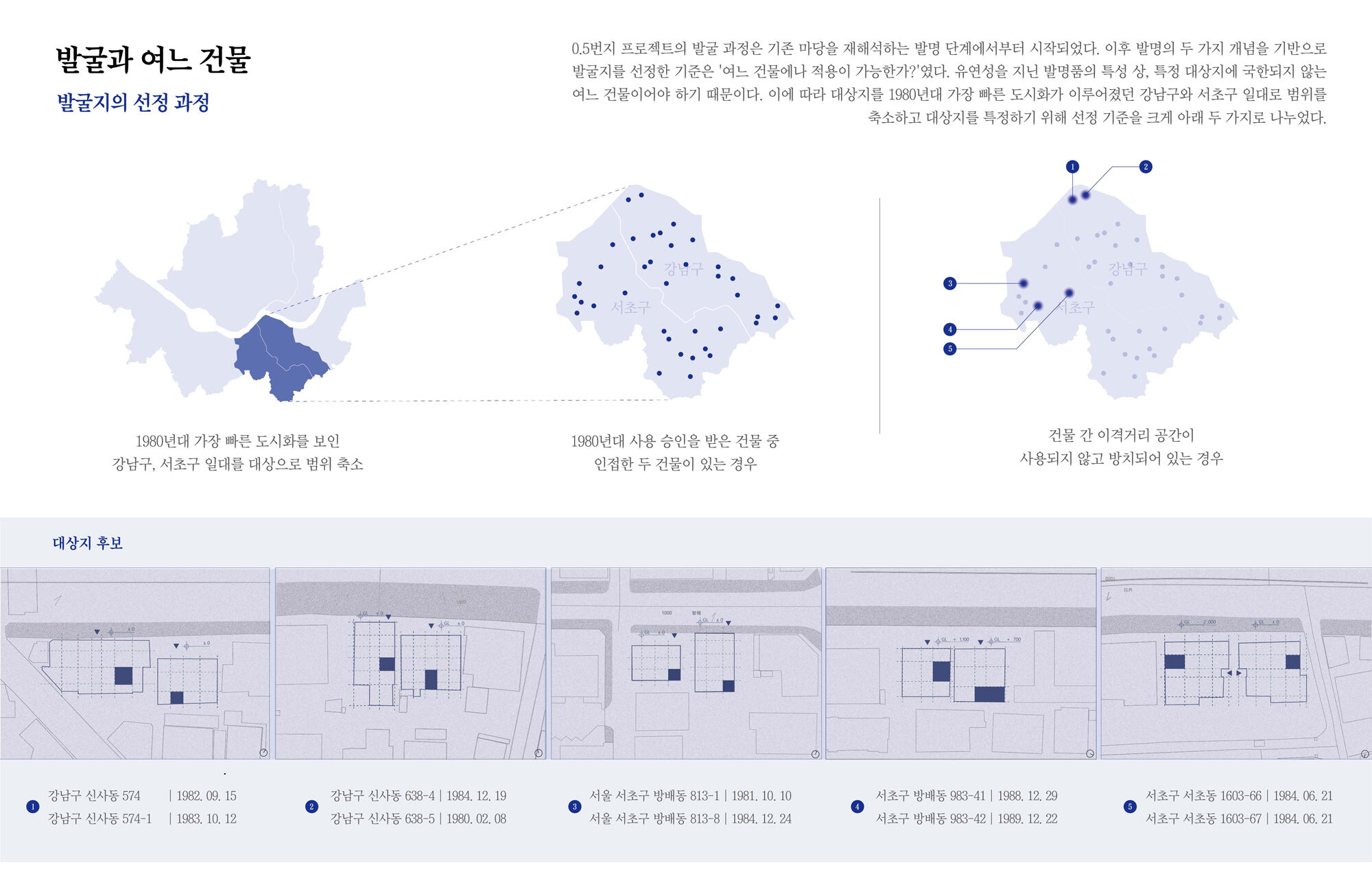 유연성을 지닌 발명품의 특성상, 0.5번지 프로젝트의 발굴지는 특정 대상지에 국한되지 않는 여느 건물이어야 한다. 이에 따라 대상지를 1980년대 가장 빠른 도시화가 이루어졌던 강남구와 서초구 일대로 범위를 축소하고 대상지를 특정하기 위해 선정 기준을 첫째, 1980년대 사용 승인을 받은 건물 중 인접한 두 건물이 있는 경우와 둘째, 건물 간 이격거리 공간이 사용되지 않고 방치된 경우로 나누었다.