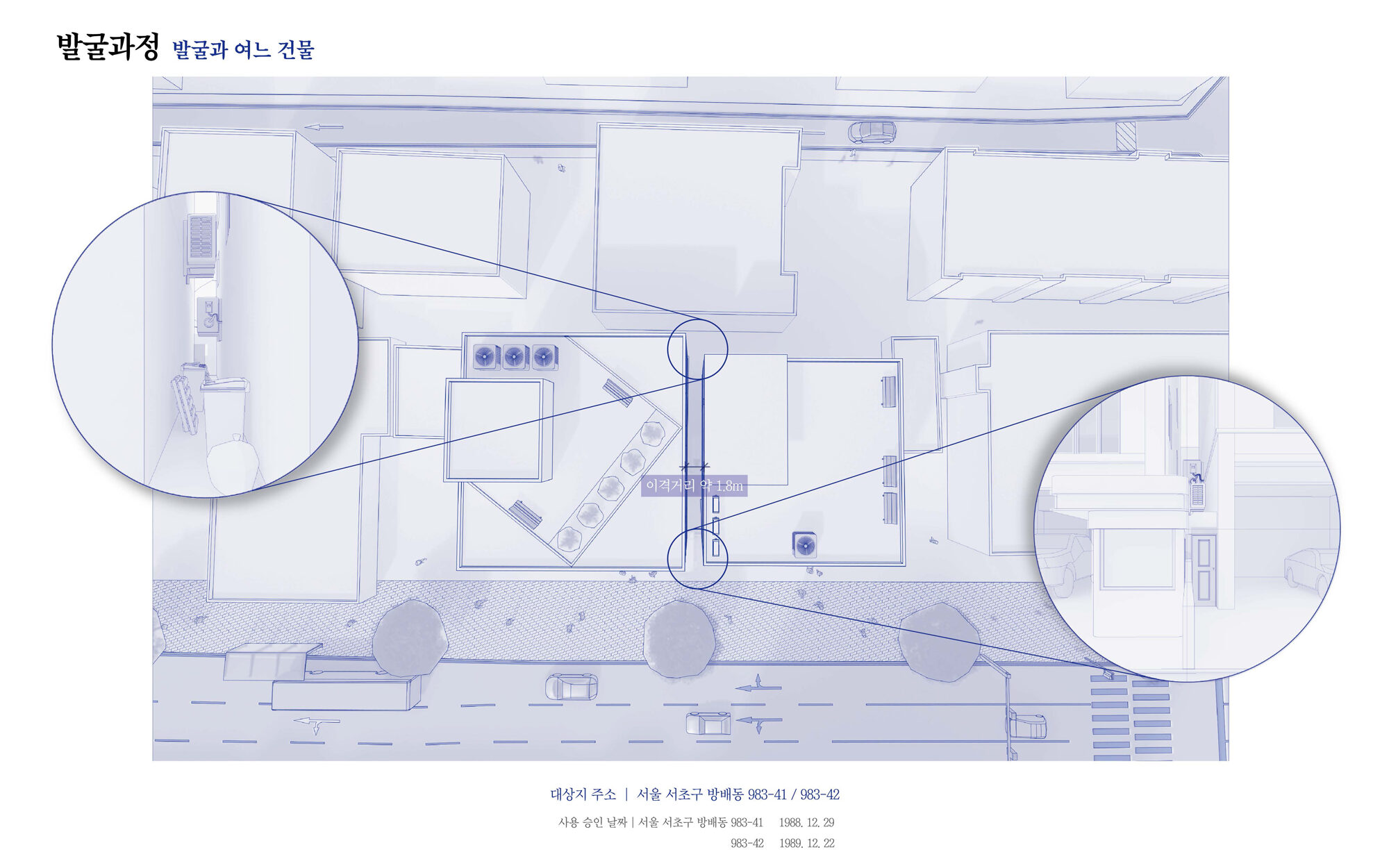 대상지 후보 중 서초구 방배동 사이트를 표준 삼아 발굴했고, 사이트 답사 결과, 현재 이 사이트는 이격거리 1.8m로, 사이 공간이 쓰레기장 혹은 야외 창고로만 사용되고 있었다. 따라서 이와 같은 사이 공간의 비효율을 해소하기 위해 앞서 정립하였던 발굴 요소를 중심으로 발굴을 진행했다.