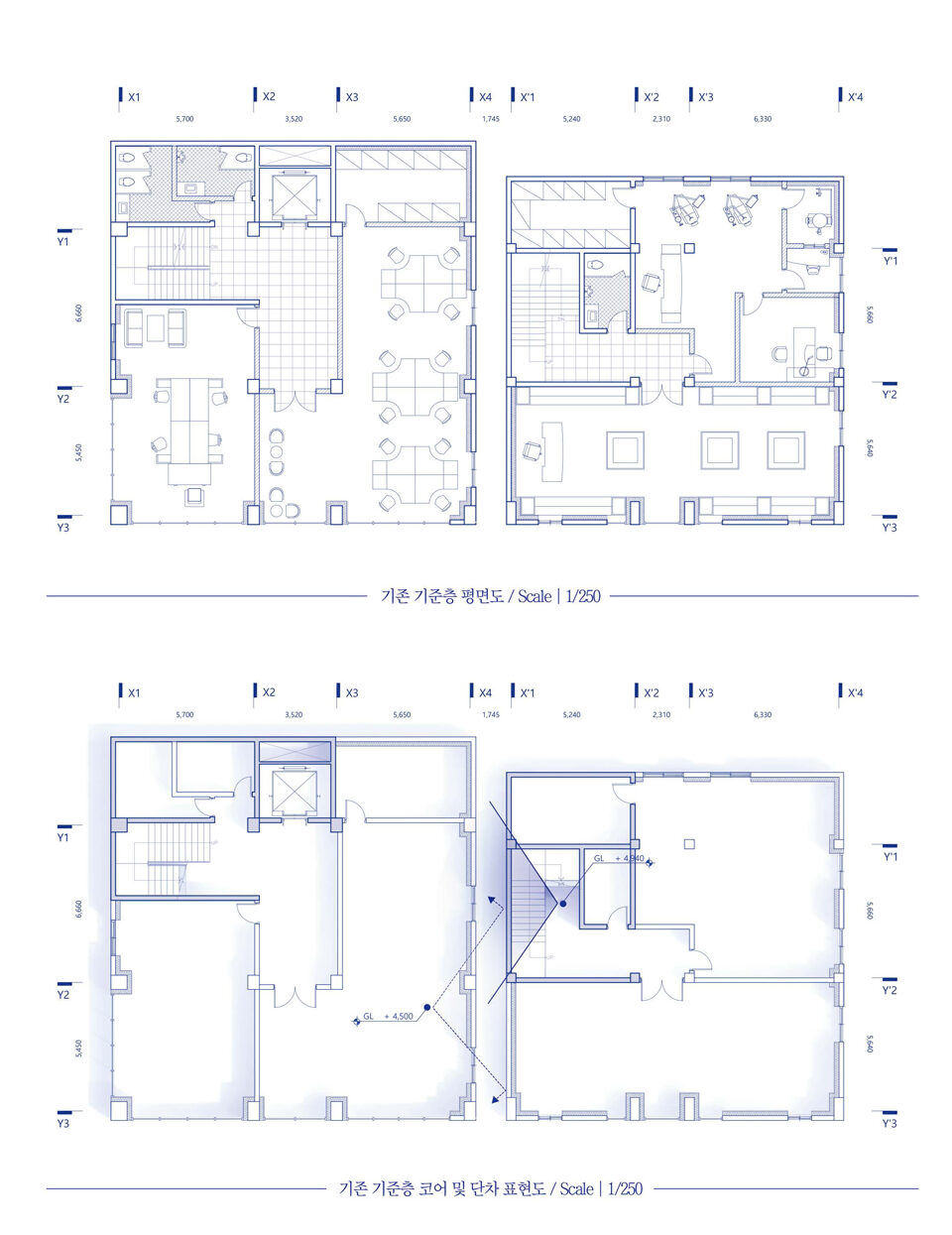 양수인 리모델링 후 평면을 보니 오른쪽 건물 코어는 없애고 왼쪽 건물 코어는 유지했다. 왼쪽 코어도 없앨 생각은 안 해봤는지 궁금하다. 어떤 생각으로 이런 형태를 취했는지 더 알고 싶다.