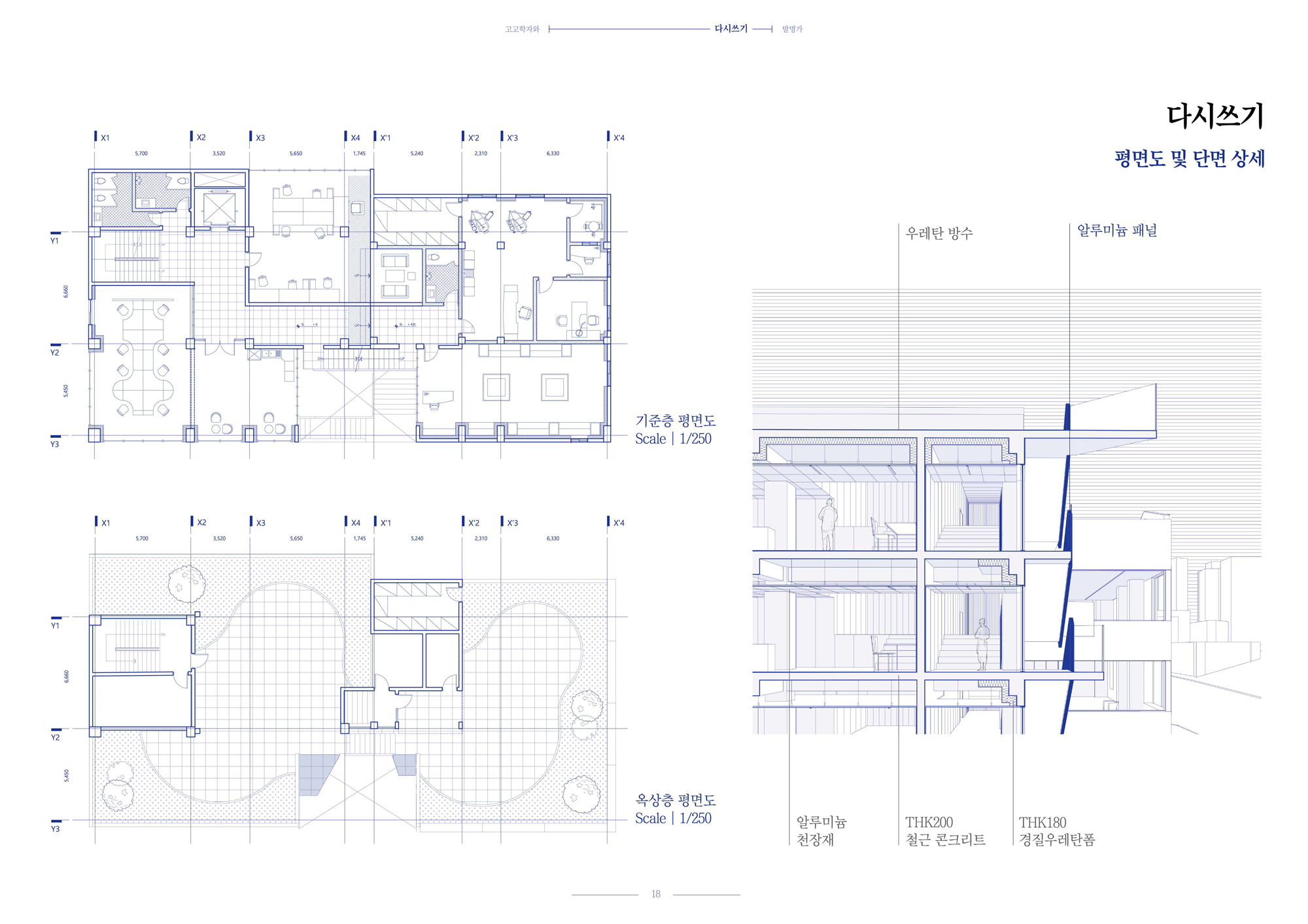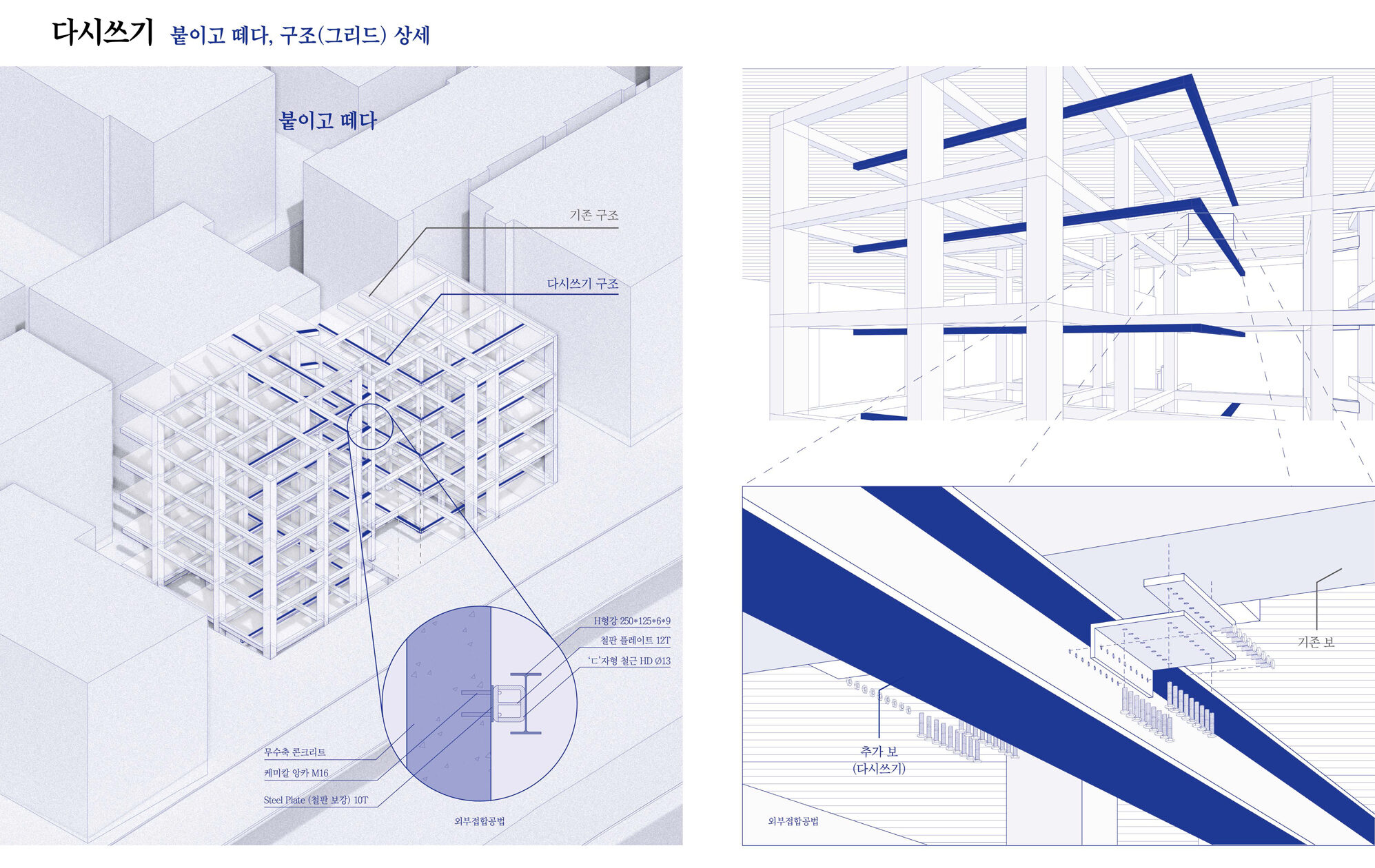 이상윤 이 프로젝트는 사이 공간을 이용하는 다른 프로젝트와 차별화된 방식으로 접근했다. 특히 맞벽 건축 개념을 통해 중간 영역을 채우는 것을 넘어, 이 부분을 건물의 새로운 파사드로 구현한 것이 특징적이다. 보통 사이 공간을 고스란히 일체화하며 채워 넣는데, 붙이면서 오히려 두 건물을 세 개의 입면으로 만든 효과를 얻은 것이 큰 장점이다. 발굴 핵심 요소도 보편적인 이야기를 조화롭게 끌어낸 방식인데, 이 팀에서 생각한 맞벽 건축의 방향성이 두 개를 세 개의 입면으로 보이게 하는 전략이었는지, 아니면 프로젝트 특성상 그렇게 적용된 것인지 궁금하다.
