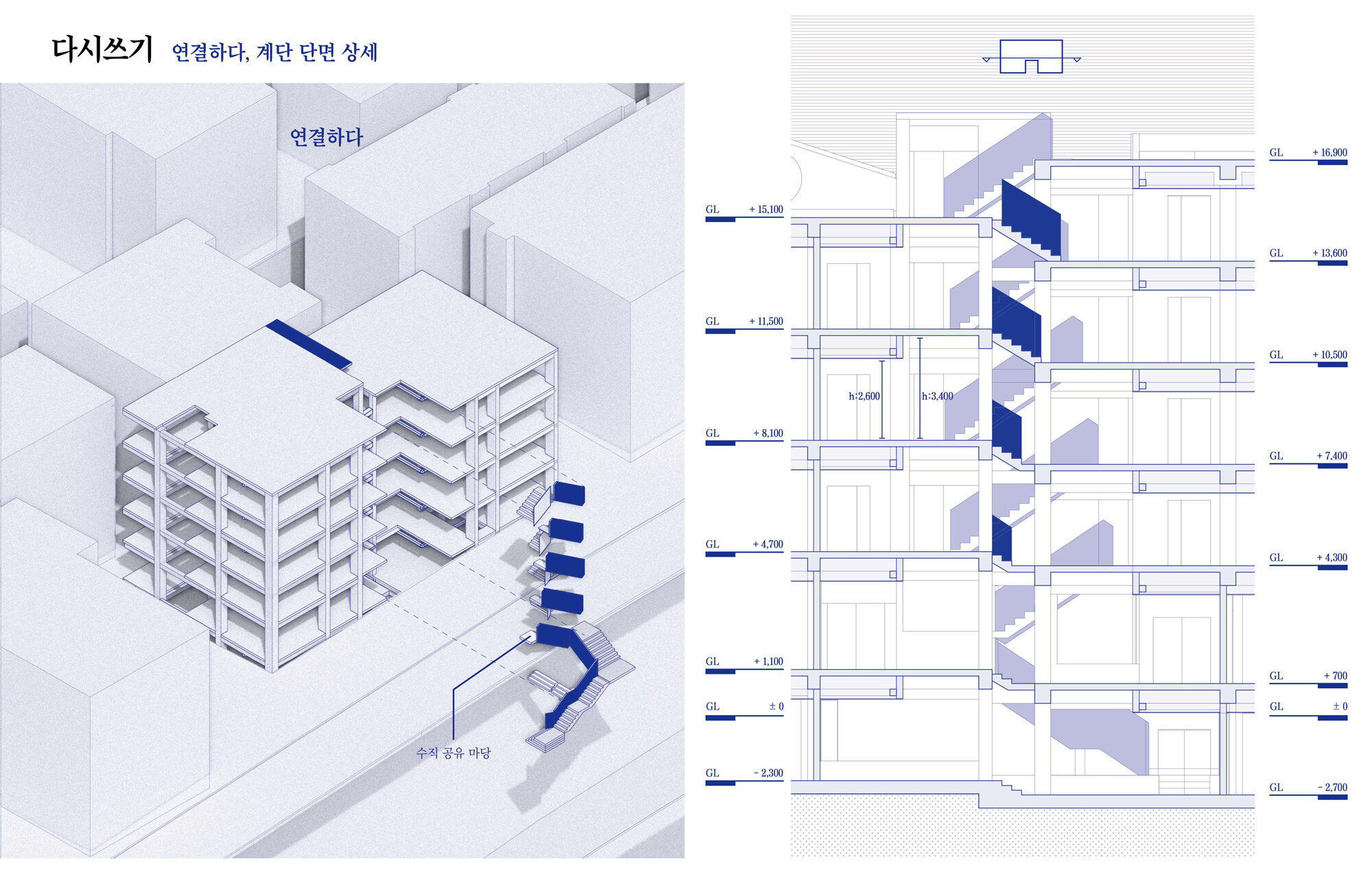 ‘연결하다’ 에서는 수직적 마당의 개념을 추가하여 다시 쓰기 위해 단차와 코어 위치를 발굴해냈다. 이를 통해 수직 마당을 구성하는 계단의 개수와 공공 공간의 크기를 산정하였다.