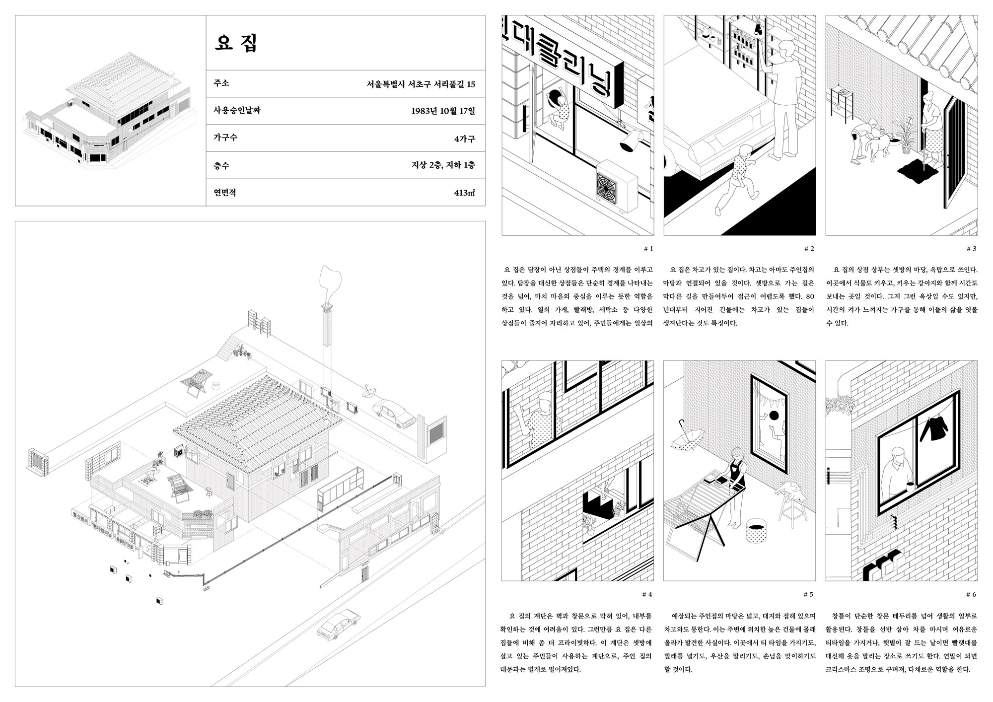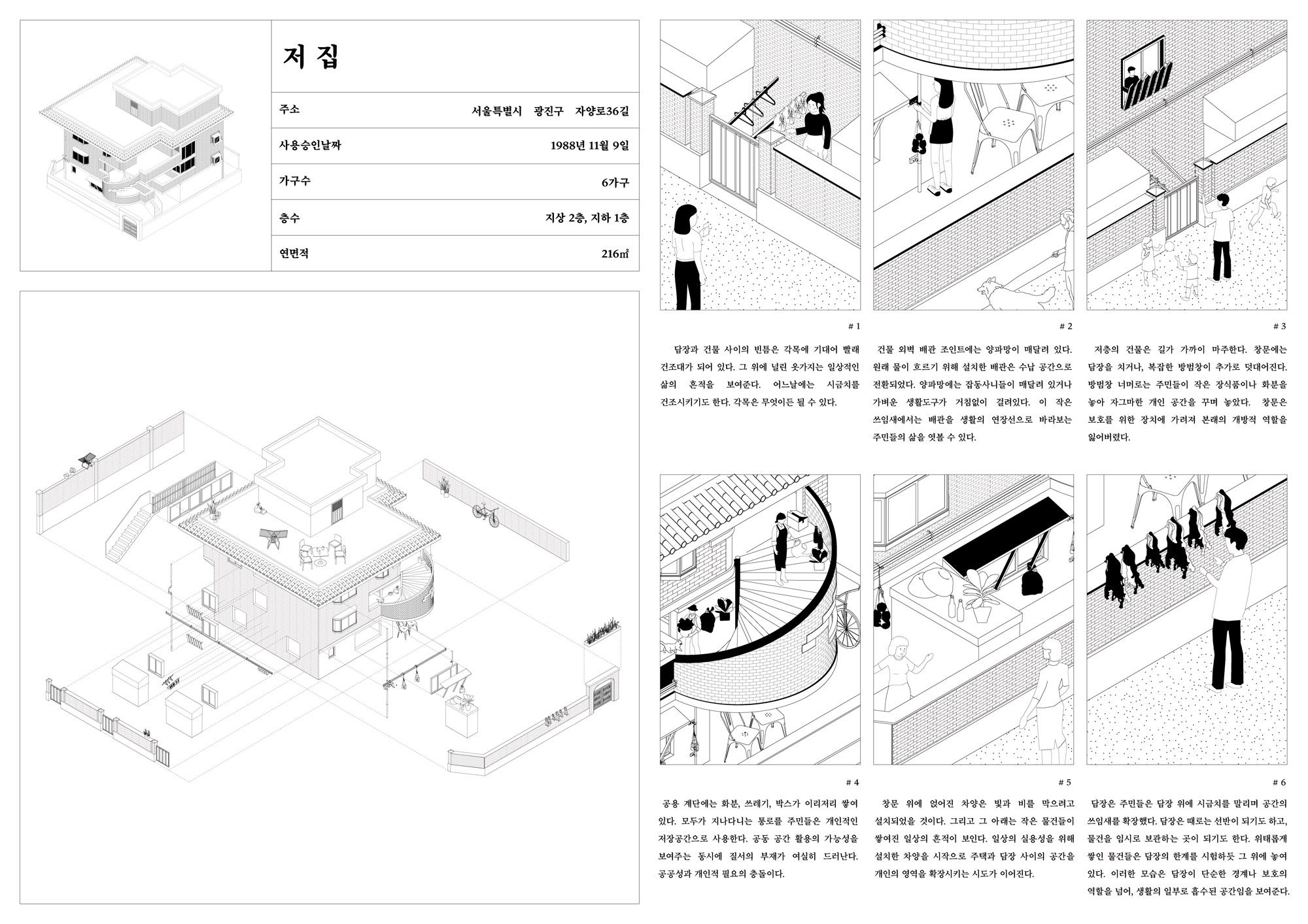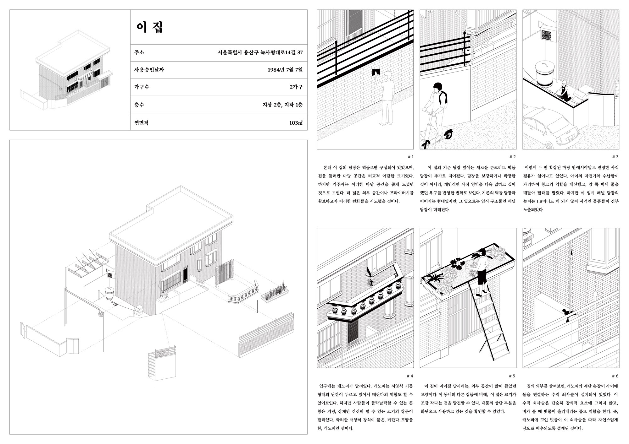 서울에 펼쳐진 여느 주택들을 수집했고, 여기에는 집의 요소들을 무작위로 조합해 만든 가상의 집이 섞여 있다. 가상과 실제를 구분할 수 없는 이 과정을 통해 여느 집의 전형을 발견했다. 합법적으로 승인되지 않았지만, 거주자의 필요로 덧붙여지고, 암묵적으로 용인되는 불법 증개축 행위는 다세대 주택을 다시 쓰고 있는 방법일지도 모른다. 거주자의 필요와 욕구에서 출발한 끝없는 장식과 흔적이 점점 더 쌓이면 그 미래는 어떤 형태로 나타날지 상상하기 쉽지 않다. 그러나 이 미래를 상상할 겨를도 없이 이름 없는 집들은 흔적을 남기지 않은 채 이름 있는 아파트로 바뀐다. 이 땅따먹기 게임에서 아파트가 모든 땅을 차지하는 것이 아닌 다양한 주거 형태가 공존하며 무승부 게임으로 남을 방법과 미래를 고민해야 한다.