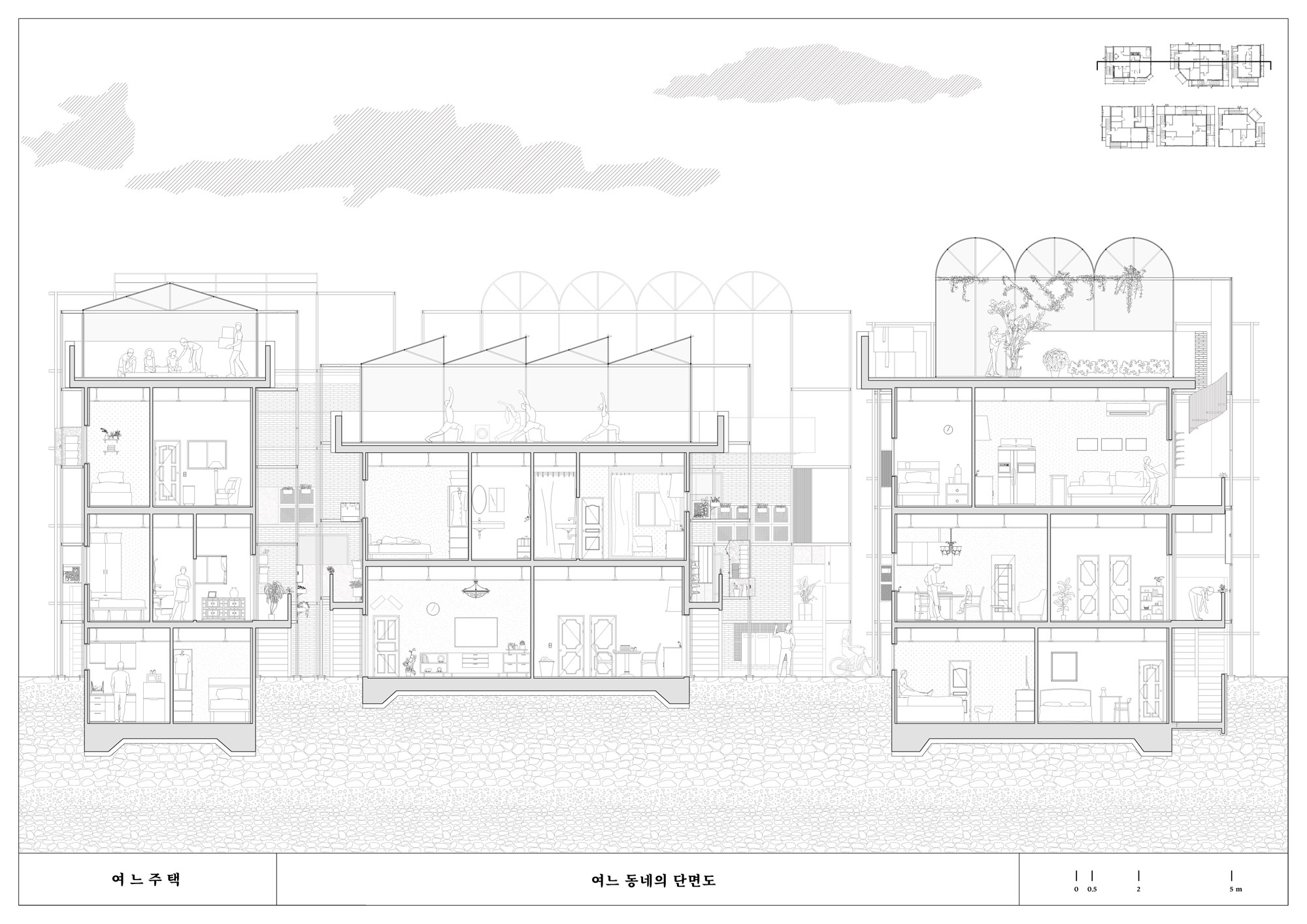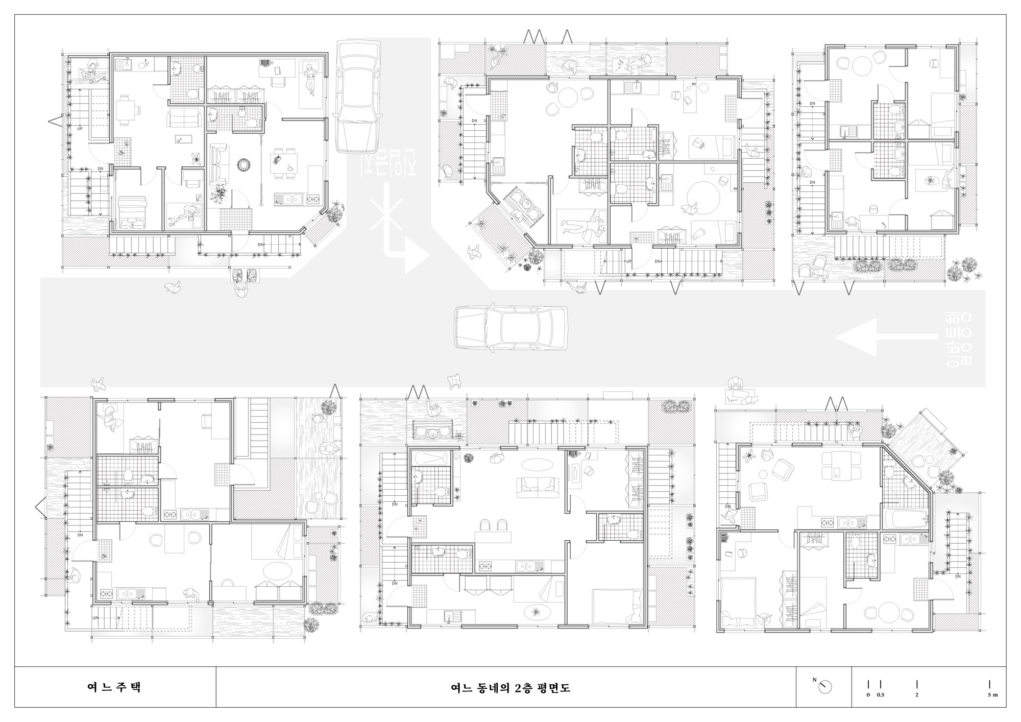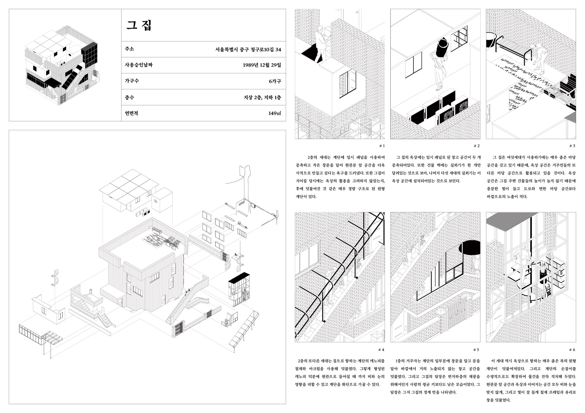 서울에 펼쳐진 여느 주택들을 수집했고, 여기에는 집의 요소들을 무작위로 조합해 만든 가상의 집이 섞여 있다. 가상과 실제를 구분할 수 없는 이 과정을 통해 여느 집의 전형을 발견했다. 합법적으로 승인되지 않았지만, 거주자의 필요로 덧붙여지고, 암묵적으로 용인되는 불법 증개축 행위는 다세대 주택을 다시 쓰고 있는 방법일지도 모른다. 거주자의 필요와 욕구에서 출발한 끝없는 장식과 흔적이 점점 더 쌓이면 그 미래는 어떤 형태로 나타날지 상상하기 쉽지 않다. 그러나 이 미래를 상상할 겨를도 없이 이름 없는 집들은 흔적을 남기지 않은 채 이름 있는 아파트로 바뀐다. 이 땅따먹기 게임에서 아파트가 모든 땅을 차지하는 것이 아닌 다양한 주거 형태가 공존하며 무승부 게임으로 남을 방법과 미래를 고민해야 한다.