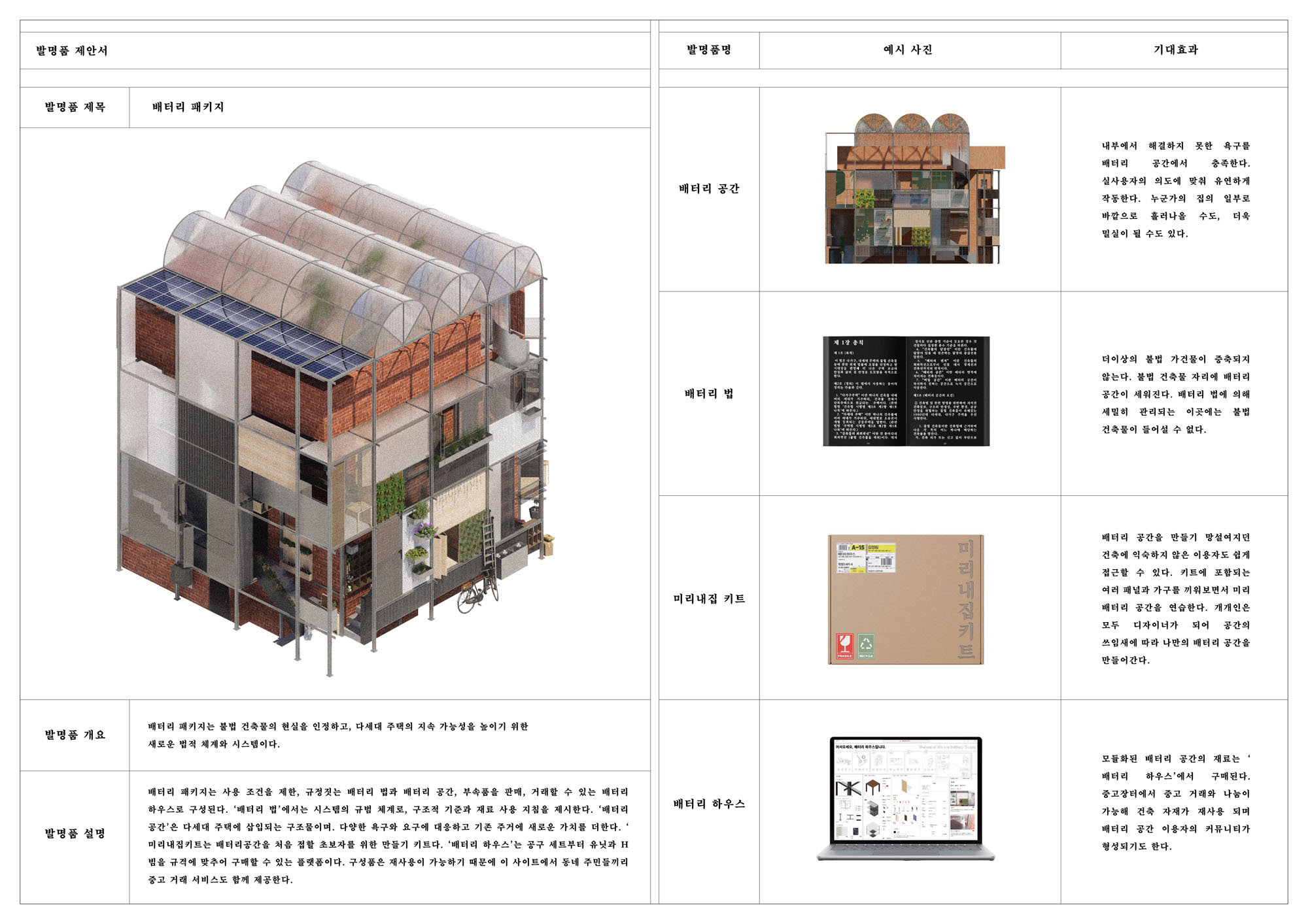 주택을 다시 쓰기 위한 건축적 발명품으로 배터리 패키지를 제안한다. 발굴한 대상은 특정 주택이 아니라 도시의 여느 주택이기에 이 제안은 불법 증·개축의 모습처럼 가변적이고 유연한 시스템이어야 한다. 배터리 패키지는 배터리 법, 배터리 공간, 배터리 하우스와 미리내집키트로 구성된다.