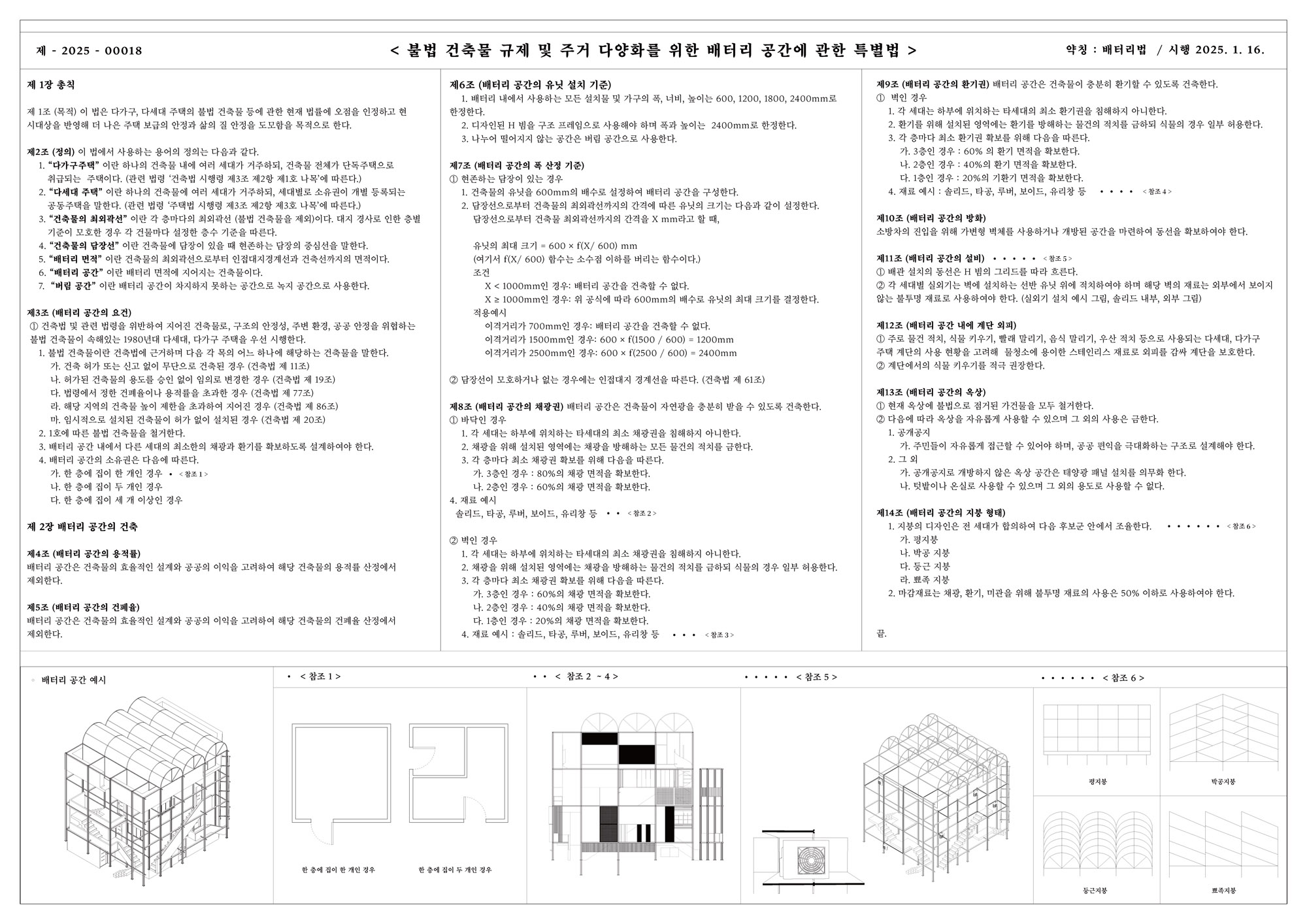 배터리 공간은 거주자의 필요를 수용하는 동시에 기본적인 생활환경을 개선하며 공간 활용도를 높인다. 이는 단순히 주택 환경을 보완하는 것에 그치지 않고, 기존 구조의 한계를 극복하며 사회의 해묵은 숙제인 도시 미관 정비와 불필요한 법적 논쟁을 줄이는 데 기여할 수 있다. 거주자는 배터리 법을 지키며 그 안에서 치밀하게 그들의 공간을 만들어내는 모습이 보인다. 또한 불법 가건물로 난무했던 옥상은 텃밭, 공개공지 등 공공의 편익을 위해 함께 쓰는 이용자들과 상의해 결정할 수 있다. 배터리 공간은 큰 힘과 전문적인 지식 없이도 모두가 손쉽게 조립할 수 있다. 상세도에서 12조에 따른 계단 디자인과 유닛의 결합 방식을 설명한다.