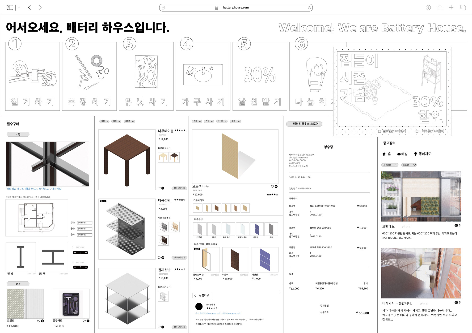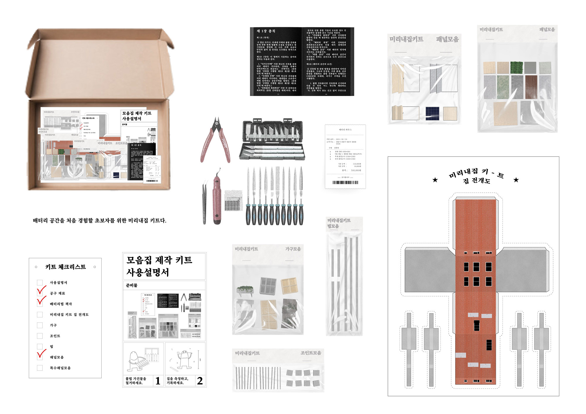 배터리법에 따라 가건물 철거와 실측 과정을 거치면 미리내집키트를 수령한다. 1/30 스케일이며 쉬운 재료와 설명서로 구성했다. 다양한 자재와 가구를 넣어보며 배터리 공간을 고민하는 과정을 거친다. 미리내집키트를 통해 결정한 재료를 배터리 하우스에서 구매할 수 있다. 사이트에서는 조립이 간편한 유닛 특성을 고려해 동네 주민과 자재를 나누거나 판매할 수 있는 게시판도 운영된다. 배터리 하우스에서 주문한 재료를 받으면 배터리 공간을 사용할 수 있다. 기존 주택 내부에서 비롯된 문제들은 외부까지 영향을 미치며, 불법 건축물과 같은 문제를 야기했다. 배터리 공간의 개입을 통해 내부의 욕구를 외부에서 충족할 수 있으며, 이를 통해 집 내부의 환경과 상황의 변화도 기대할 수 있다.