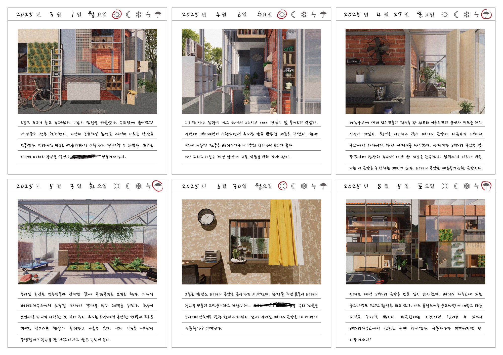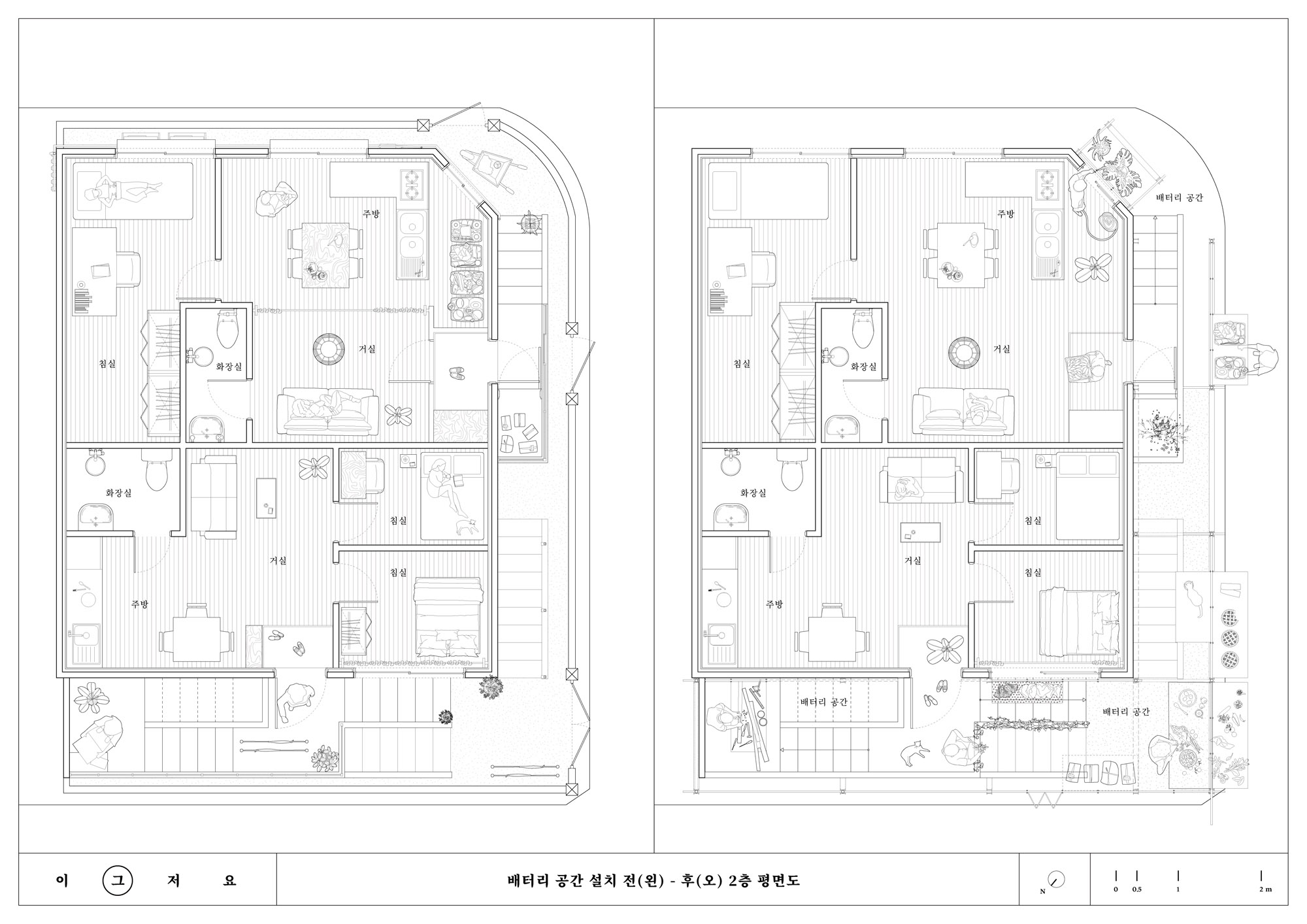 담장과 가건물을 허물고 난 후, 집 안으로 바람과 햇빛이 잘 들어오고, 적절한 가구와 키울 식물을 고민한다. 이웃의 배터리 공간을 구경하는 재미가 생겼고, 공개공지로 옥상을 사용해 배터리하우스에서 감면 혜택을 받는다. 제법 동네에 배터리 공간이 많이 생겨 이웃 간의 거래도 활발해진다. 우리의 발굴과 발명은 다세대 주택이 가진 여전한 잠재력을 발견하고, 지속 가능한 주거 공간으로 다시 쓰일 수 있다는 믿음을 바탕으로 한다. 우리가 찾아낸 해답이 완성된 결론이 아닌 다른 가능성을 향한 출발점이 되기를 바란다.