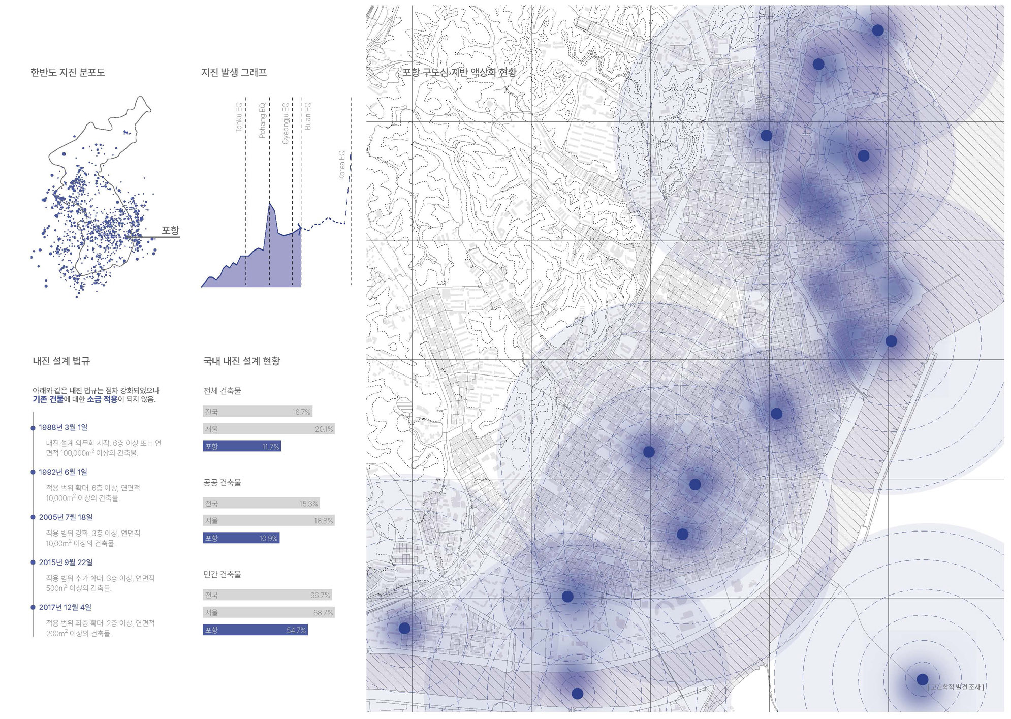 과거 일본의 도호쿠 대지진 이후 한반도의 지층 구조가 변화하며 지진 발생 빈도와 강도가 증가하였고, 경주·포항 지진을 계기로 한반도가 더 이상 지진 안전지대가 아님이 확인되었다. 하지만 현행 내진 설계 기준은 기존 건축물에 소급 적용되지 않아 여전히 구조적 위험에 노출되어 있다. 특히, 내진 설계가 미비했던 경북 지역, 그중에서도 포항 구도심은 1980년대에 건축된 건물이 많고, 무분별한 증축이 이루어지면서 구조적 취약성이 더욱 심화되었다.