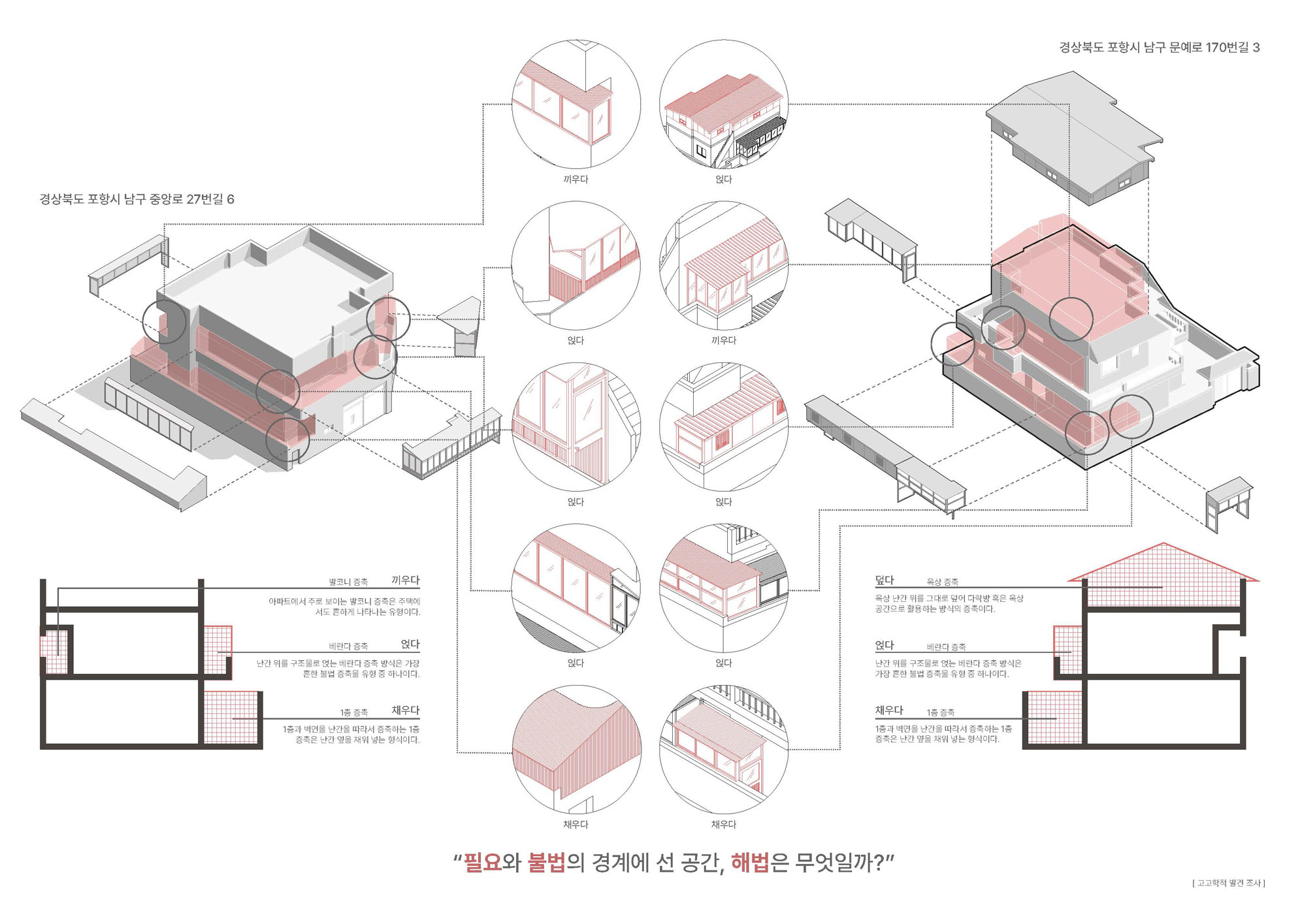 틈-공간 불법 증축물이 메탈 구조로 되어 있어 전국 어디서든 적용 가능하다고 생각한다. 전체를 메탈 구조로 하면 원재료의 느낌을 살리고 강성도 확보할 수 있어 구조적 해결도 가능하다고 본다.