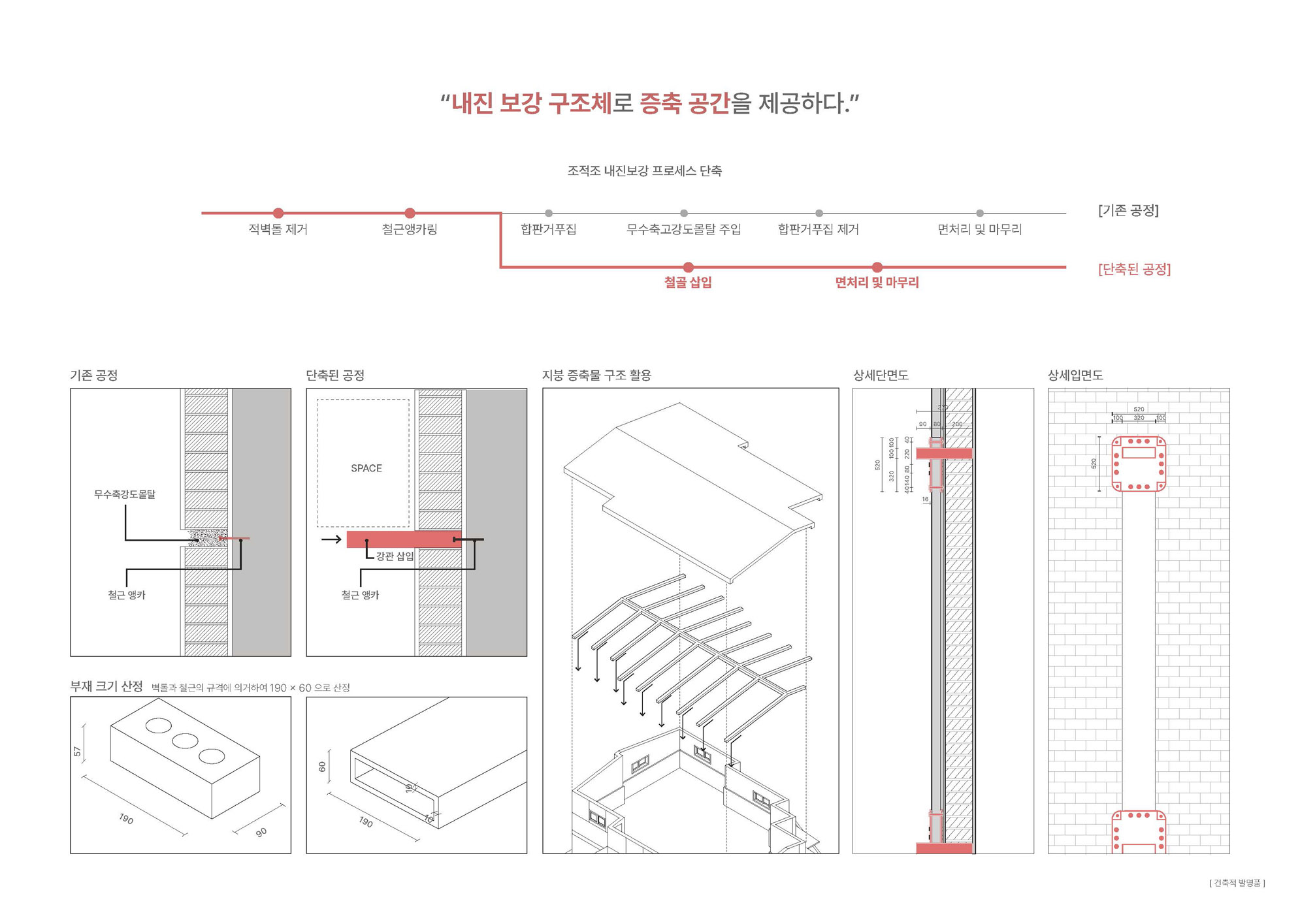 현재 내진 설계 장려 정책이 실효성이 낮은 이유는 개인이 내진 보강을 통해 얻는 실질적 이득이 크지 않다고 인식하기 때문이다. 하지만 불법 증축 공간을 활용하여 내진 보강을 병행한다면, 내진 보강의 패러다임을 전환할 수 있다. 본 연구에서는 기존 조적조 건물의 내진 보강 방식(벽돌 제거 후 몰탈 주입)을 철재 강관 삽입 방식으로 대체하여 구조적 안정성과 공간 확장을 동시에 달성하는 방안을 제안한다.