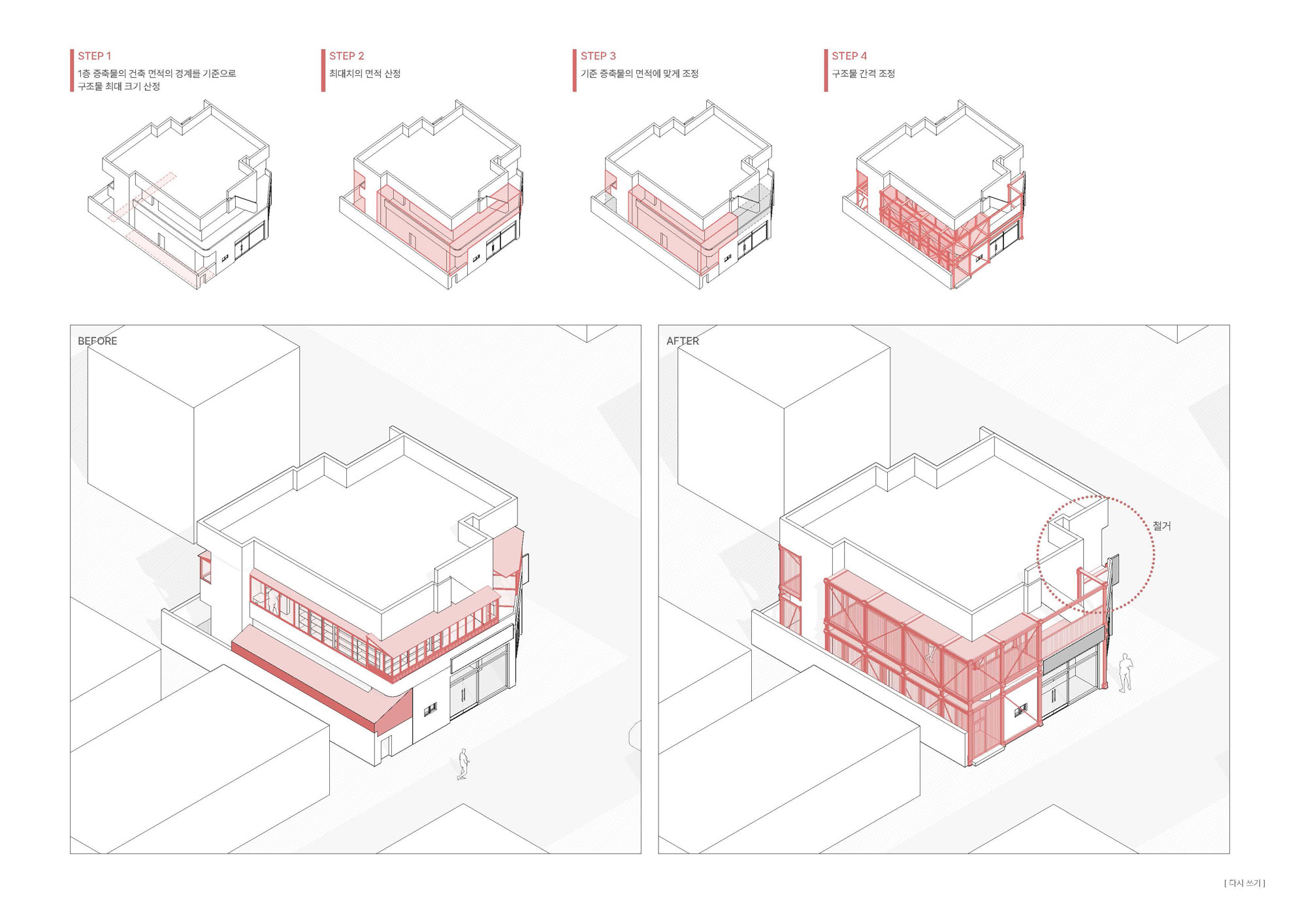 이를 통해 기존보다 넓은 공간을 확보하고, 구조적 안정성을 강화하며, 철재 활용으로 재사용 가능성을 높이고, 노후 증축물의 재료를 교체하여 도시 미관을 개선할 수 있다. 설계 적용을 위해 기존 증축 공간을 분석한 결과, 상가 1층에는 12㎡ 규모의 창고가, 2층에는 18㎡ 및 4㎡ 크기의 창고가, 통로 및 창고로 활용되는 5㎡ 공간이 존재하였다. 1층 증축물 외부 경계를 기준으로 증축 구조물 최대 크기를 산정하고, 수직적으로 볼륨을 형성하여 연면적을 최적화하였다.