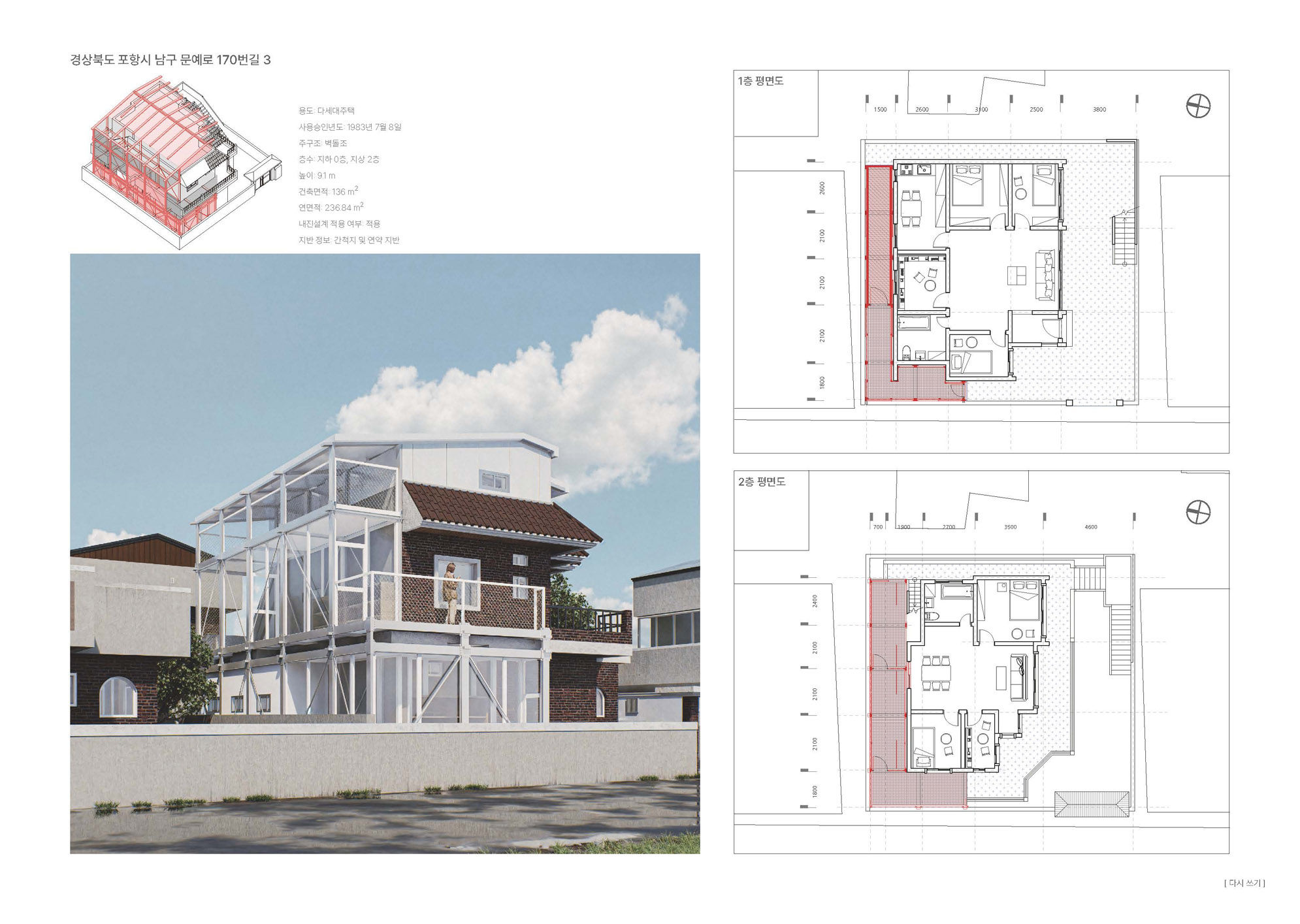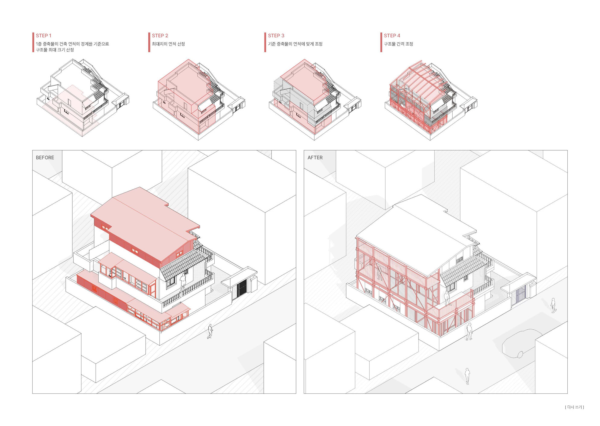 주택의 경우, 1층에 20㎡, 2층에 7㎡, 3층 옥상에 62㎡ 규모의 증축 공간이 확인되었다. 기존 서까래 구조를 활용하여 하중을 효과적으로 지면에 전달하도록 설계하였으며, 프라이빗 공간 형성을 위해 기존 주택에 사용된 샌드위치 패널의 특징을 적용하였다.