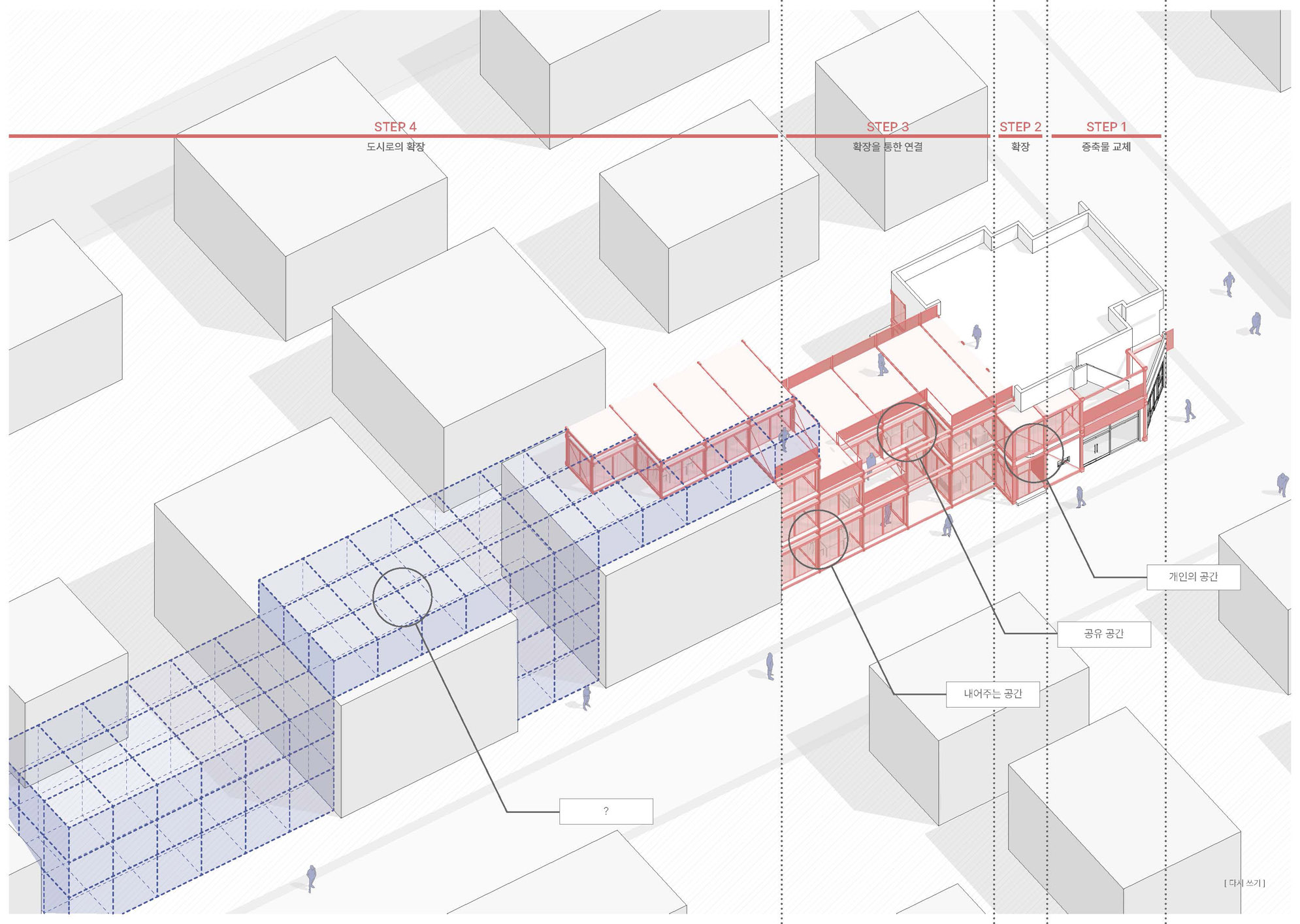 본 설계는 노후 건축물의 수명을 연장하는 것을 넘어, 미래 지속 가능성까지 고려한 계획이다. 1, 2단계에서는 개인의 증축 공간을 재구성하고 확장하는 데 중점을 두며, 3단계에서는 개별 증축물이 서로 연결되어 공유 공간으로 활용될 수 있다. 궁극적으로 4단계에서는 이러한 구조가 도시 전체로 확장될 가능성이 있다.