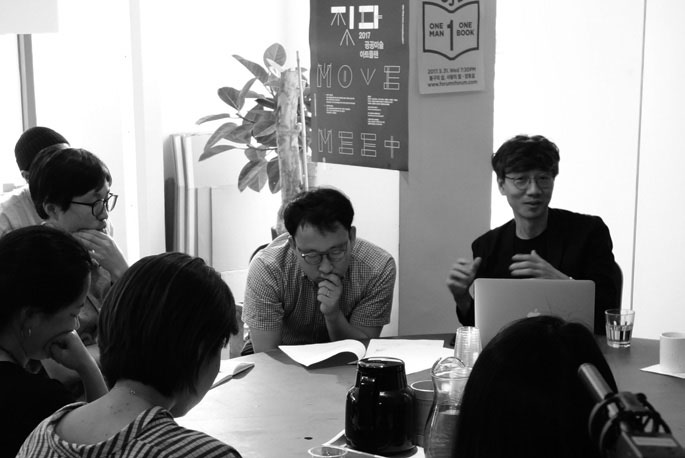 장홍석 저는 공공미술이라는 것이 어떤 것인지 잘 모르겠습니다. 여기서 말하는 공공미술, 혹은 시민을 위한 어떤 예술적 프로젝트라는 관념적인 의미에 대한 논의가 있는 것인지? 그렇다면 우리는 이것을 리서치 안에서 그것을 구현해야 하는 것인지? 저는 이것을 리서치 프로그램이라고 생각을 했습니다. 그리고 우리가 이주를 한다는 것 자체에 대한 여러 가지 제안이 있습니다. 그 제안들도 사실은 이주를 함으로써 우리 안에서 발생하는 것들입니다. 이렇게 제안을 했을 때, 그럼 우리가 무엇을 리서치 하는 것인지? 제안한 것을 우리가 꼭 실행해야 하나? 꼭 이주를 해야 하나? 이런 의문이 듭니다. 과정 안에서 발견되는 지점을 계속 기록하고 아카이브 할 것입니다. 이것을 토대로 계속해서 어떤 식으로든 발전되고 확장될 수 있는 지점들을 찾으려고 합니다. 지금 뭐 여러가지 제안도 좋은데, 공공미술이라는 것이 꼭 공공을 위한, 일방적으로 시민을 위한 그런 어떤 예술적인 작업, 그것이 공공미술이라면, 우리가 기존의 공공미술과 다른 지점이 무엇인가라는 생각이 들었습니다.