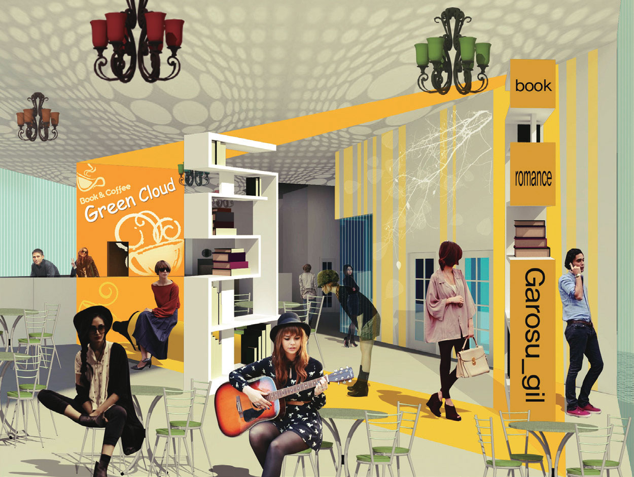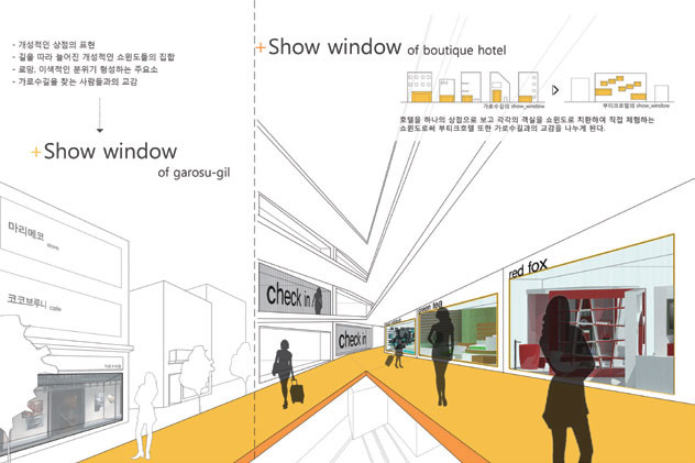 이러한 시도에 가로수길만의 부티크 호텔을 만들기 위해 ‘쇼윈도(show-window)’ 개념을 적용했다. 가로수길을 따라 늘어진 쇼윈도의 집합은 로망, 이색적인 길의 분위기를 표현하며, 가로수길 이용객들과 상점을 연결해주는 매개체 역할을 하게 된다.