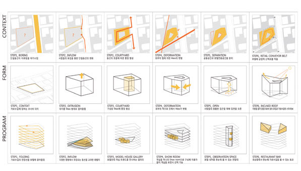 가로수길의 지루한 단일 동선에 대한 문제점을 시작으로 접근하였다. 사람들을 유입을 통해 단일 동선의 변화시키고자 하였고, 공용 공간과 호텔 전용 공간이 분리되면서 호텔에 ‘retail conveyor belt’, 즉 상업적 산책로를 적용하게 된다. 이것은 접기(folding) 기법을 이용해 가로수길을 호텔에 끌어들이게 되며 객실을 하나의 쇼룸으로 구성해 쇼윈도 개념을 담았다.