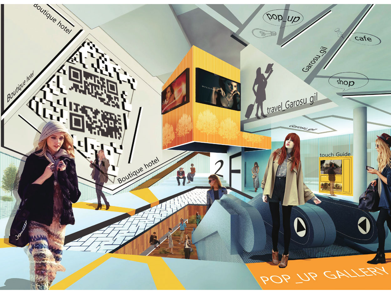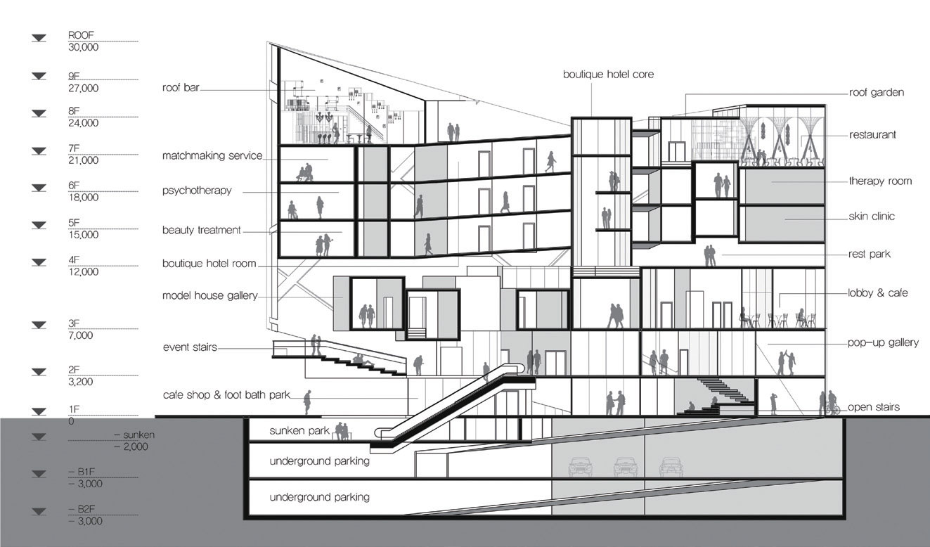 또한 앞서 언급한 단일 동선이 낳는 지루함이 공용 공간의 부재로 귀결된다. 따라서 다양한 방향의 동선을 고려한 레벨 차가 발생된 저층부에는 공용 공간이 위치하게 된다. 여기에는 가로수길의 또 다른 쇼윈도를 표현한 족욕 공간, 야외 선큰, 허브 계단 등의 부티크 광장과 팝업 스토어를 이용한 팝업 갤러리, 모델하우스 개념을 이용한 부티크 체험관이 위치한다.
