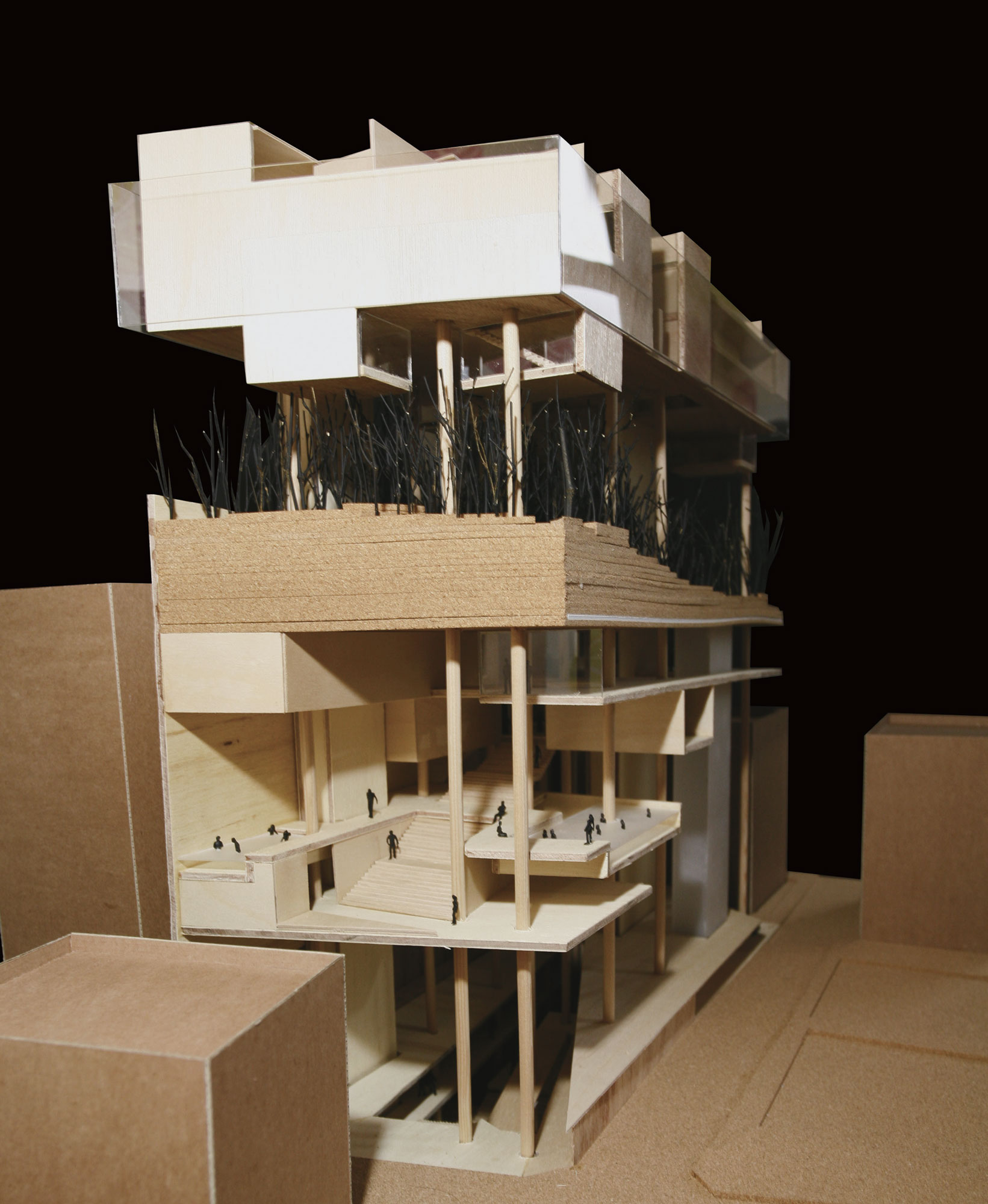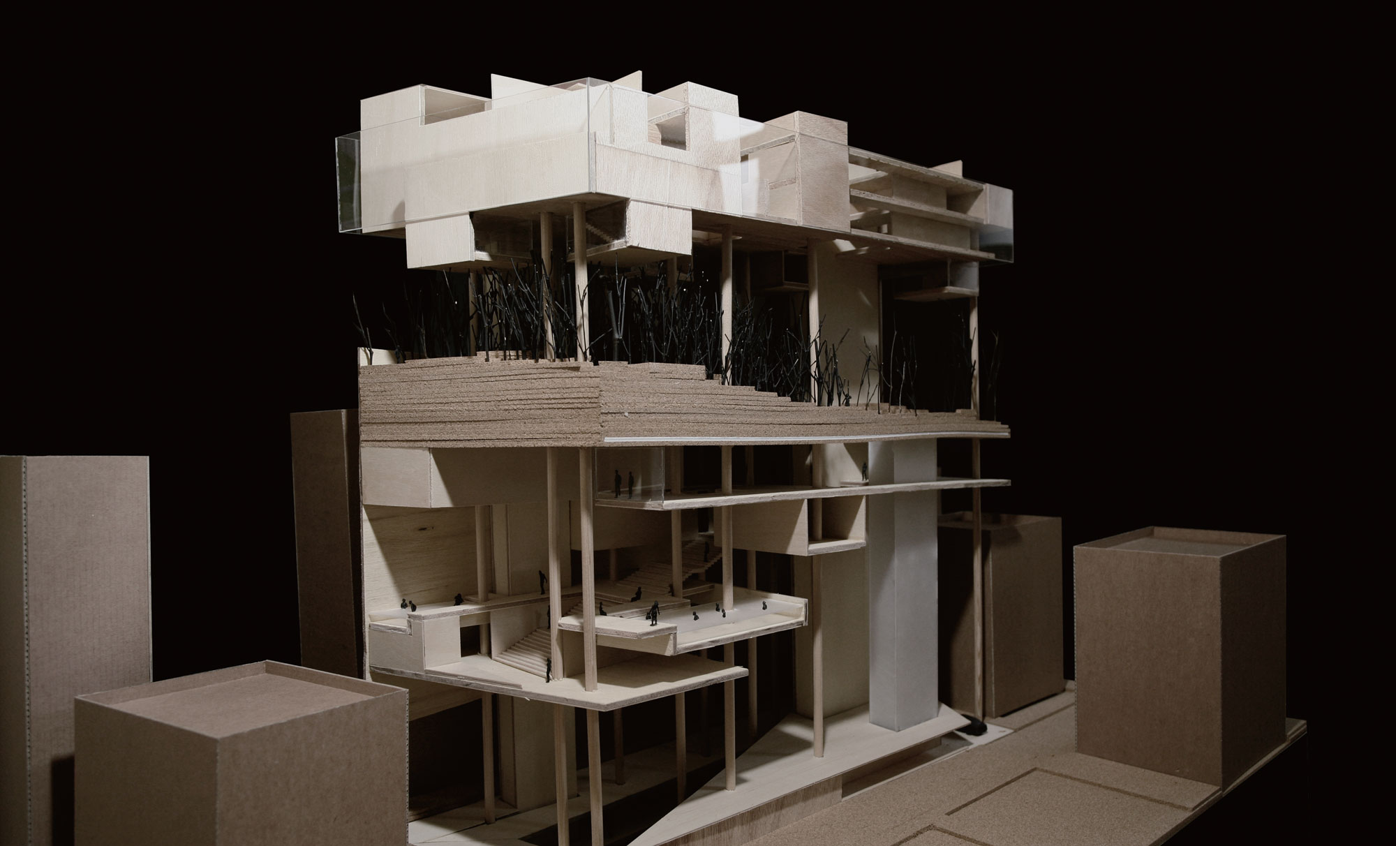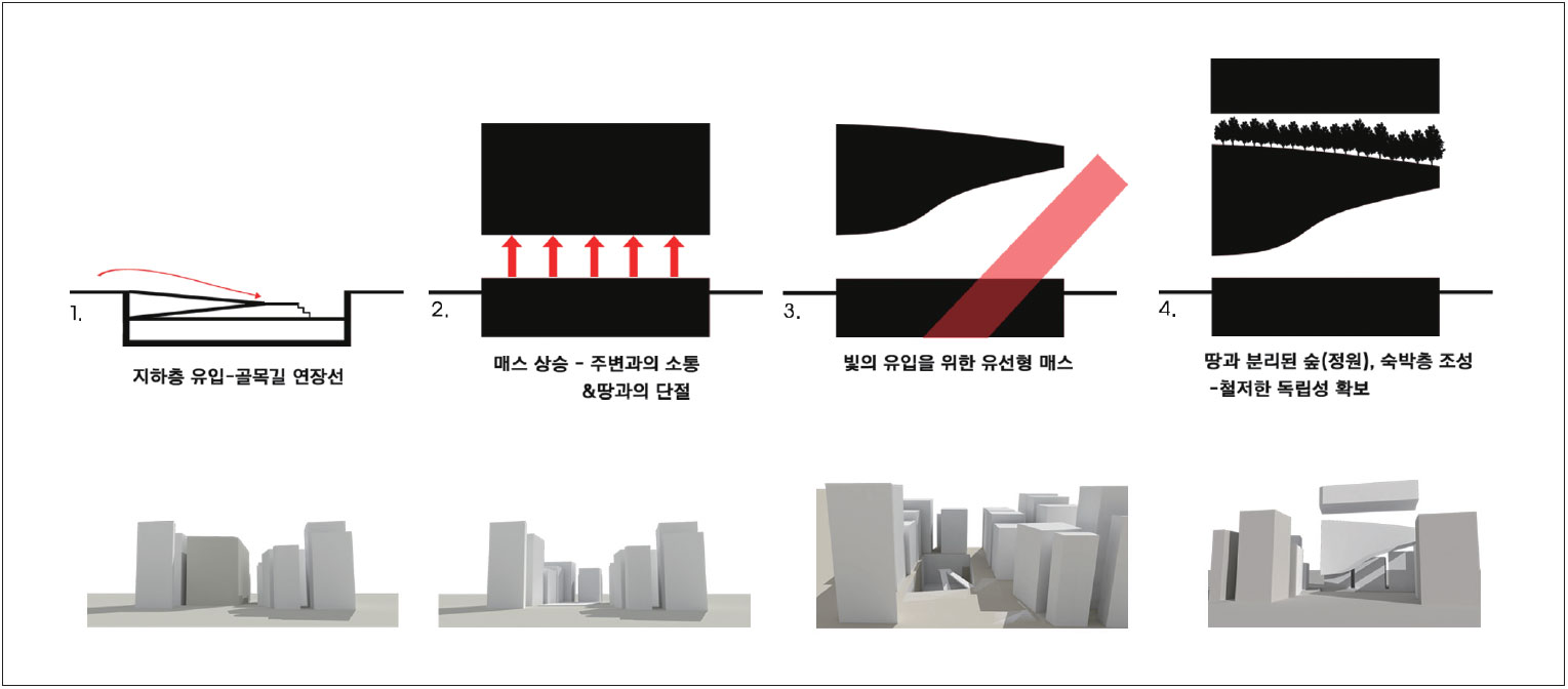 대지를 비워내고 경사로를 활용해 골목길의 연장선을 만들어 지하는 골목길 위에 있는 홍대 문화 공간이 된다. 매스를 띄워 지상층은 주변과 소통되게 하고 띄워진 매스는 땅과 단절시켜 사용자들의 독립적인 공간을 만들어준다. 그 위에 숲을 만들어 호텔 투숙객들만을 위한 공간을 제공한다.