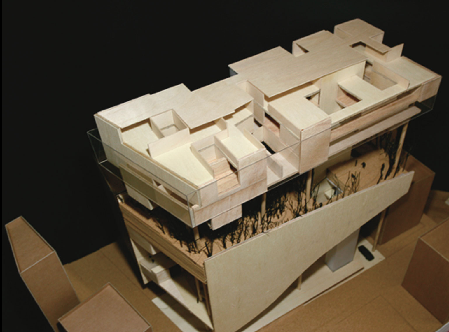 매스를 띄워 지상층은 주변과 소통되게 하고 띄워진 매스는