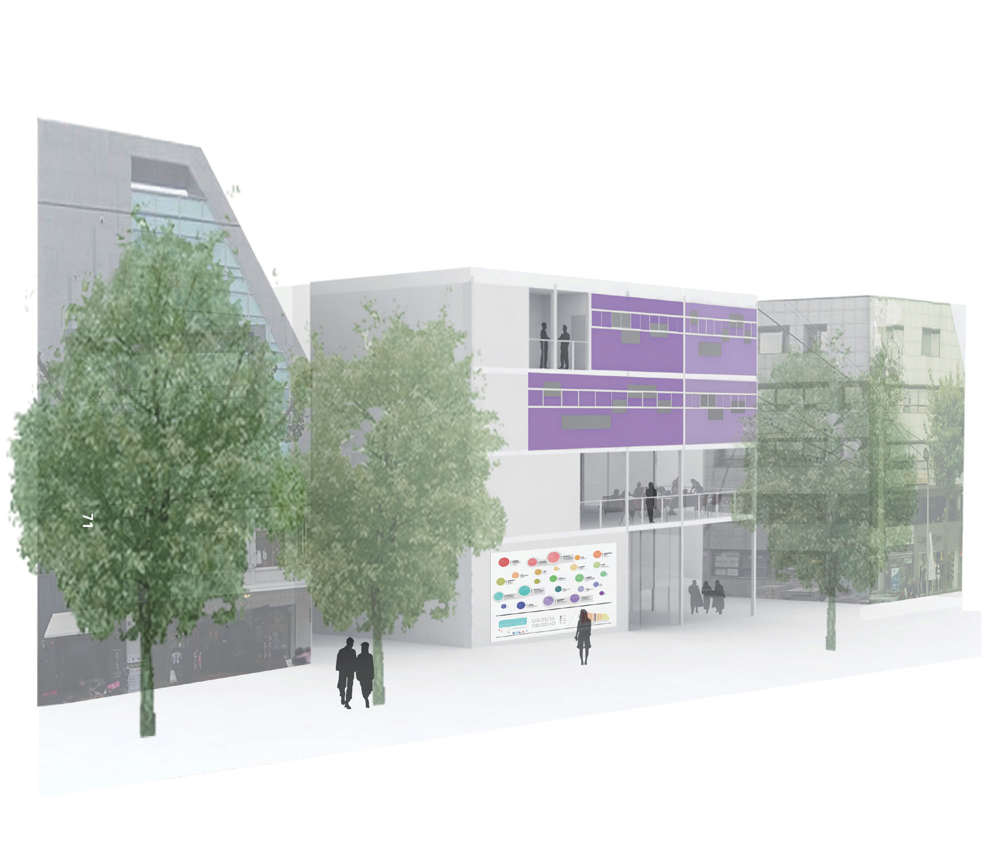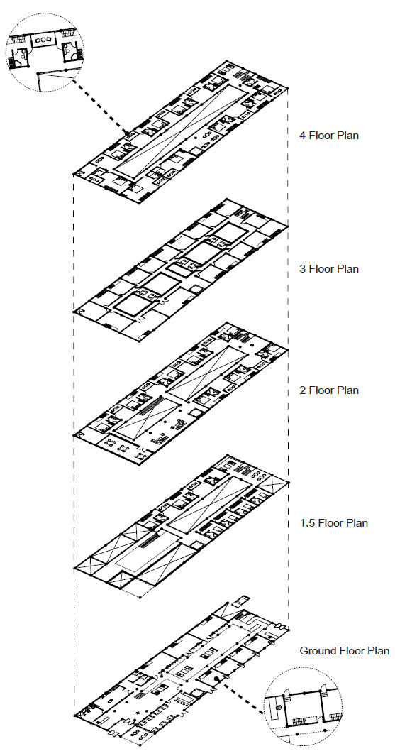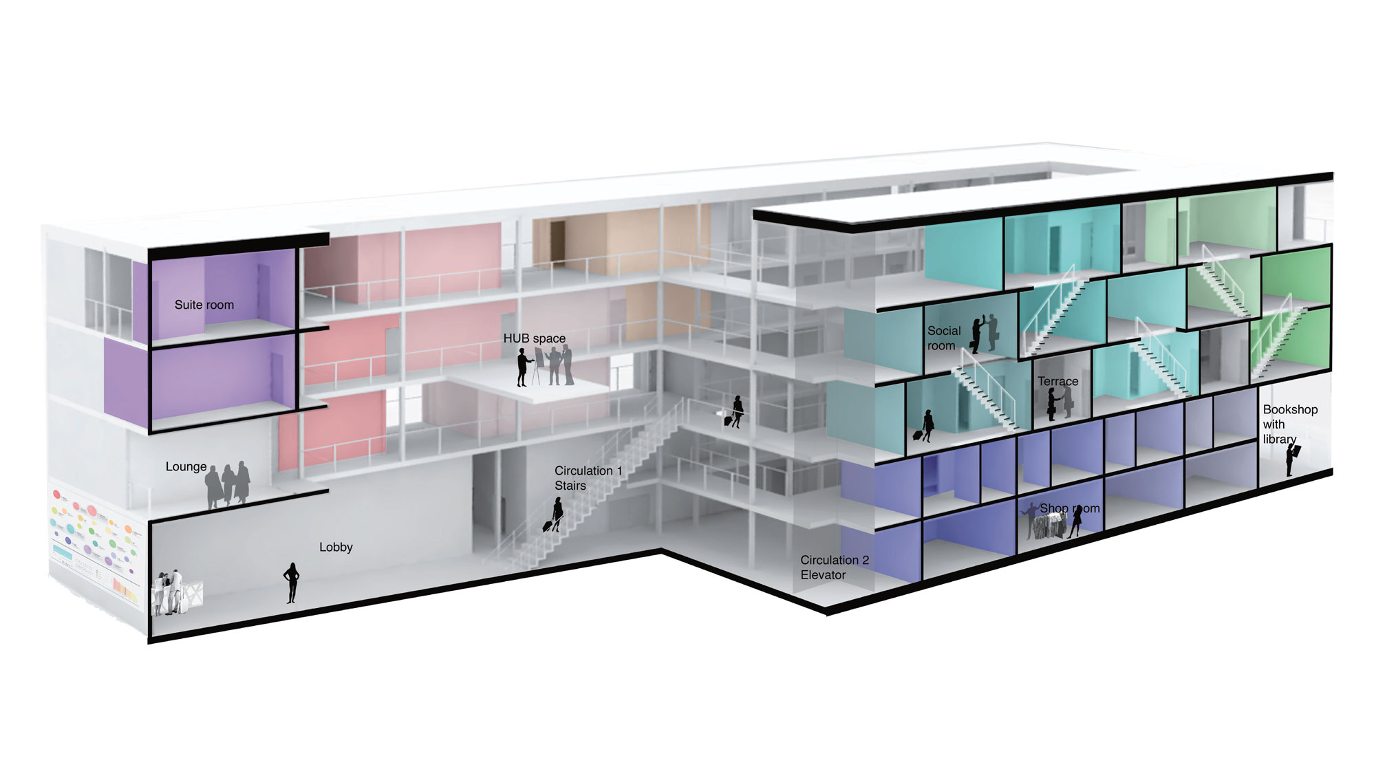 현재의 가로수길은 그러한 성격을 잃고 대형 자본에 의해 획일화된 대도시 거리가 되어가고 있으므로, 구상해놓은 시나리오에 호텔 허브로 인해 가로수길이 옛 모습을 되찾는다는 것을 추가하기로 하였다. 기존 가로수길이 갖고 있던 산책길의 성격을 가장 잘 보존하고 있는 거리를 찾아 그 거리의 연장선상에 호텔이 놓이게 해 하나의 길 역할을 함과 동시에 가로수길의 허브로서 작용하도록 건물의 전체 매스와 동선을 구성했다. 그 안에 방 유닛들을 교류를 위한 공간으로 작용하도록 배치하고 그 공간 안과 사이사이에 여러 장치를 두어 투숙객이 공간을 직접 만들고(DIY) 자신의 목적에 맞게 타인과 교류할 수 있도록 하였다. 방 유닛은 하나의 로프트 룸(loft room)으로, 호텔이면서도 방을 교류할 수 있게 복층으로 하여 한층은 침실, 한 층은 소셜 룸(socialroom)이 되게 하였다.