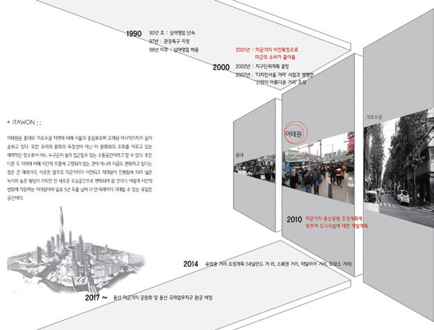 으로, 미군기지 이전 후 공원화가 진행됨에 따라 넓은 녹지와 높은 빌딩이 가득 찬 새로운 도심 공간으로 변화될 것이다. 이렇게 시간 변화에 적응하는 이태원은 5년 후를 넘어 미래까지 기대할 수 있는 유일한 공간이다.