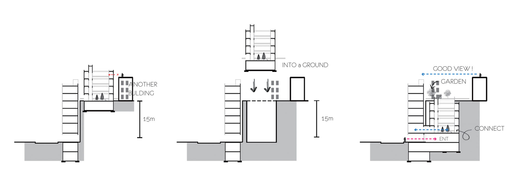 대지에 존재하는 옹벽을 이용, 매스의 반사와 흡수 개념을 통해 호텔 기능을 극대화하였다.