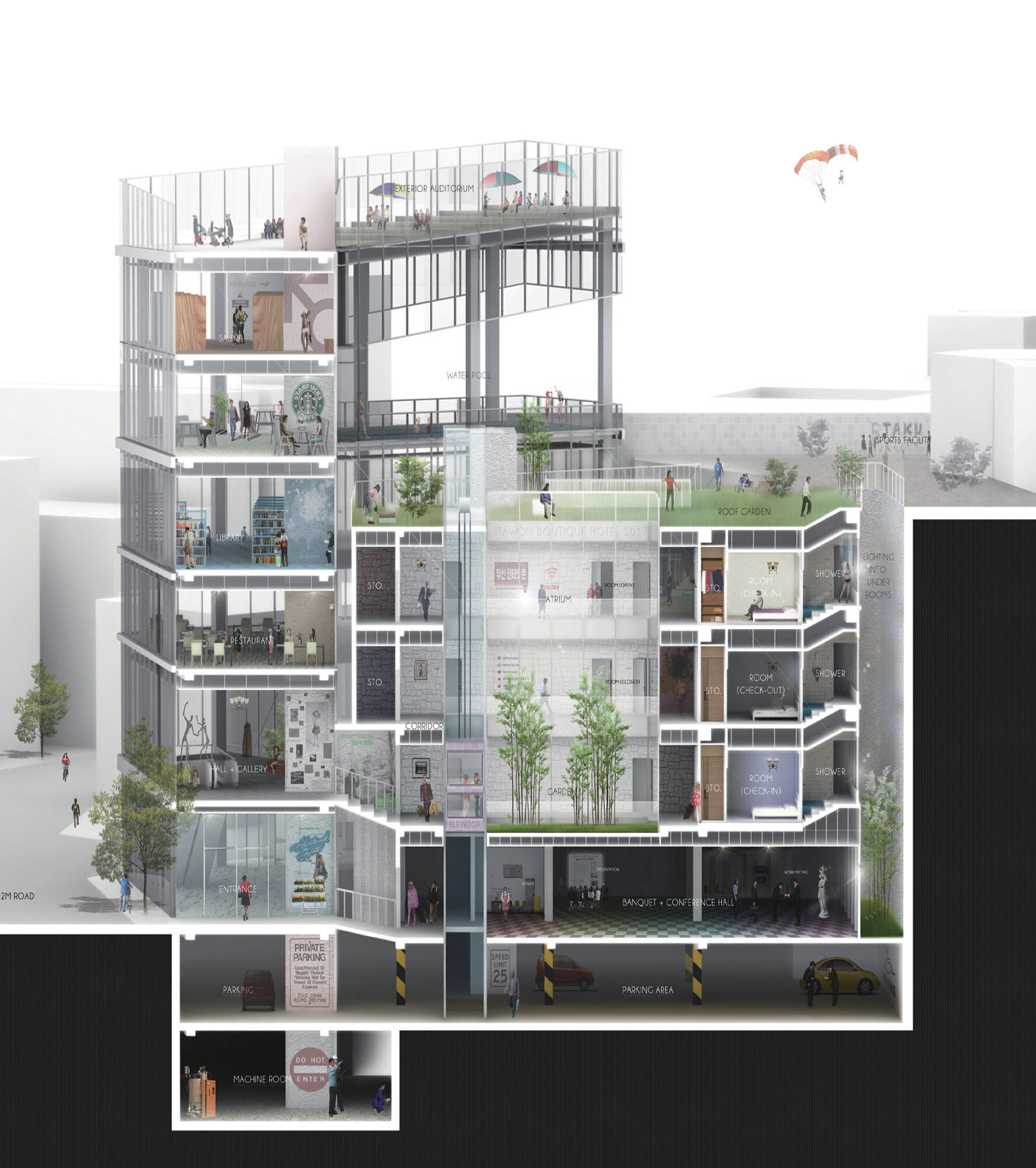 이렇게 분리된 공용 영역은 호텔 객실과는 별개로, 누구나 이용할 수 있도록 공간을 구성해 인근 주민뿐 아니라 다양한 이용객들이 부담없이 쓸 수 있도록 구성하였다. 객실 외에도 다양한 프로그램을 전면부에 배치함으로써 시시각각 변화하는 도시에 대응해 호텔을 이용하지 않더라도 다양한 이벤트를 통해 문화적인 장소를 이용, 모든 이를 수용할 수 있도록 구성하였다.