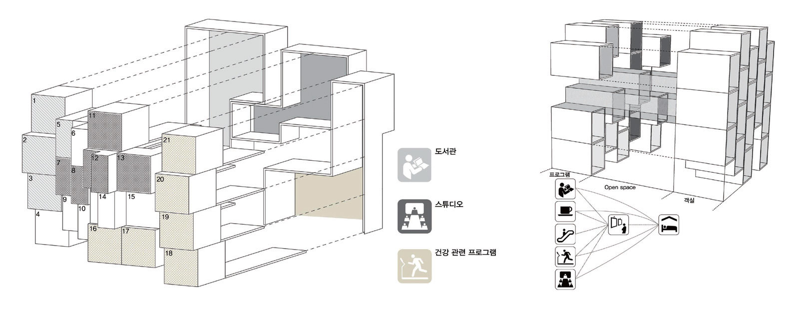 이 문제점을 보완하고자 사적 공간인 객실과 공적 공간인 호텔의 프로그램을 연계해 호텔 이용객인 여성이 시공간의 지속력을 길게 해주고자 한다. 프로그램은 도서관 같이 조용하고 개인적인 공간과 함께 스튜디오나 건강 관련 프로그램과 같이 좀 더 활동적인 공간이 있다. 이러한 프로그램 특성에 따라 호텔 내 또는 외부의 오픈 스페이스를 통해 객실이 확장이다. 즉 사적 공간과 공적 공간 사이를 이용해 연속적인 공간을 만듦으로써 시공간의 지속력을 길게 한다.