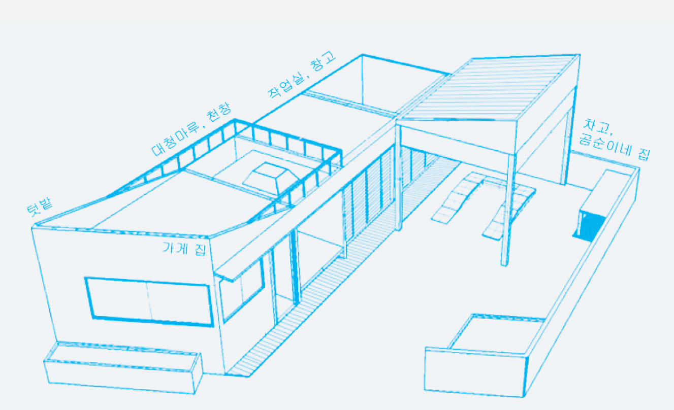 오랜 시간 동안 공간을 유지하고 보수하면서 만들어온 공간이기 때문에 기능상의 공간 구획은 건축주에게 있어 만족스러운 것이었다. 때문에 구분된 공간들의 기능은 그대로 유지하고자 했다. 다만 물품 보관 공간을 효율적으로 활용하고, 이곳에서 혼자 많은 시간을 보낼 건축주의 일상을 위해 생활공간과 작업공간을 구분하고자 했다. 중동에서 산업역군으로 젊은 시절을 보낸 건축주는 시대의 흐름에 의해 이 직업을 선택하게 되었지만 그의 어릴 적 꿈은 목동이었다. 가끔 화단에서 키운 상추를 뜯어 이웃들과 둘러 앉아 바비큐를 하고, 작은 텃밭이 딸린 시골의 전원주택에서의 삶을 꿈꾸는 건축주를 위한 공간을 계획하고자 한다. 낯선 이들을 위한 공간이 아닌, 동네 사람들이 자유롭게 드나들며 커뮤니티를 형성하는 마실이 되었으면 한다. 고물과 작업도구가 가득한 기능 위주의 공간이 아닌, 이웃에게 늘 열려있는 ‘그 가게’가 되는 것이다.