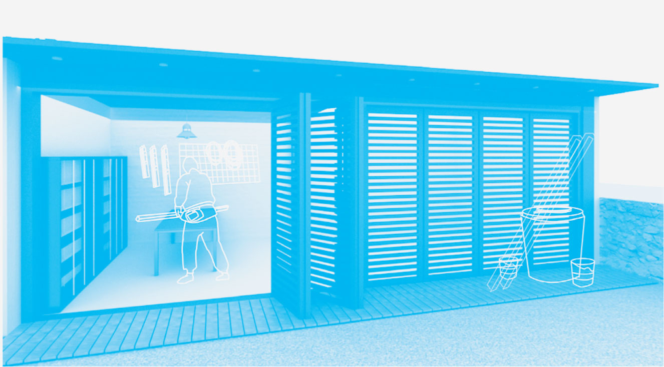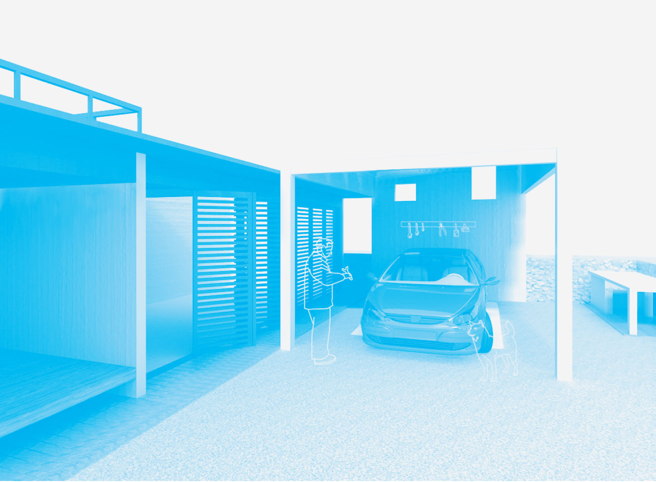 창고와 분리되지 않아 좁고 위험했던 차고를 따로 구획하고, 차고 뒤편에 물품을 보관할 수 있게 한다. 하루를 함께하는 강아지를 위한 공간도 마련한다.