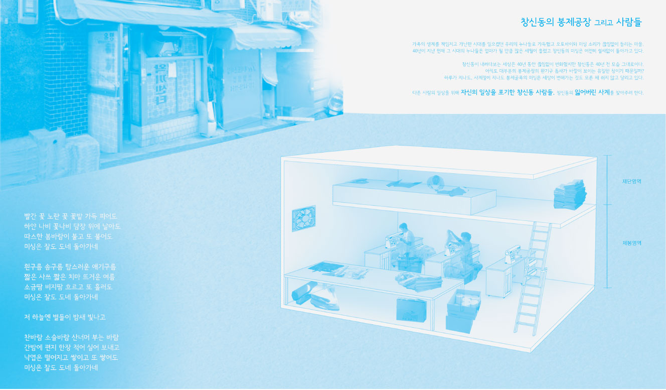 좁고 가파른 골목길을 수없이 지나가는 오토바이와 얇은 유리문과 작은 환풍기 속에서 들려오는 미싱 소리가 창신동의 첫인상이었다. 봉제 공장들이 모여 있지만 하루 종일 시끄럽고 어두운 공장에서 맡은 일을 마치느라 서로 교류할 여력도 없다. 지금은 리메이크 된 곡으로 더 잘 알려진 <사계>는 원래 1980년대에 ‘노래를 찾는 사람들’이 당시 봉제 공장 모습을 묘사하며 부른 곡이다. 사계절도 없이 좁고 어두운 공간에서 노동을 반복하는 그들에게 우리는 항상 곁에 있는 봄, 여름, 가을, 겨울을 돌려주고 싶었다.