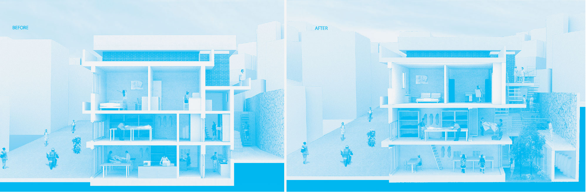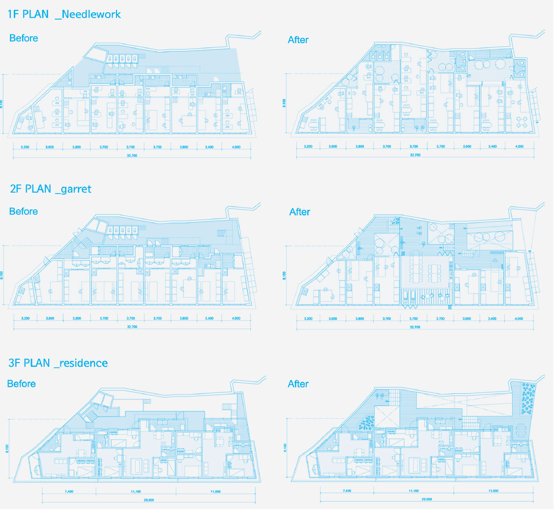 1, 2, 3층의 건축주의 동의를 구해 각자의 낡은 부엌을 허는 대신 잘 사용하지 않던 2층 중앙부 공간에 공동 주방과 식당을 만들어 먹고 나눌 공간을 마련했다. 이제까지 1, 2층의 봉제 공장 사람들과 교류가 없던 3층의 거주자들도 이곳을 이용할 수 있도록 하기로 했다. 1, 2층이 여러 봉제 공장이 입주해있다면 3층에는 3가구가 거주하고 있어 다른 접근이 필요했다. 각자의 프라이버시를 보호하는 한편 작은 텃밭을 형성하여 주거공간의 공동체 회복도 고려했다. 아이와 노인이 거주하는 3층은 기존의 위험하고 낡은 계단을 대신할 동선을 재설정했다.