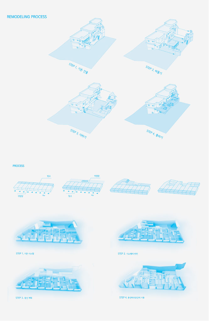 이런 리모델링 계획안에 대해 그들은 매우 만족스러워 했다. 작은 봉제 공장이 모인 그 사이의 자투리 공간을 이용하는 것 말이다. 그들에게 멀기만 했던 것을 우리에겐 익숙한 방법을 사용했을 뿐이다. 실제로 이런 것이 실현되어 그들이 일터에서 사계를 느끼고 서로 오가며 관계를 만들어 가는 일상이 그들에게도 곧 찾아오기를 기대해 본다.