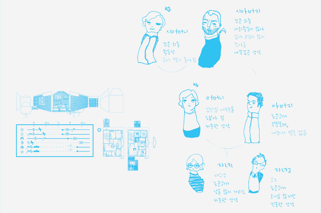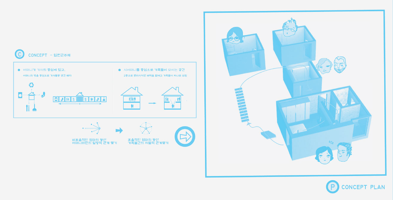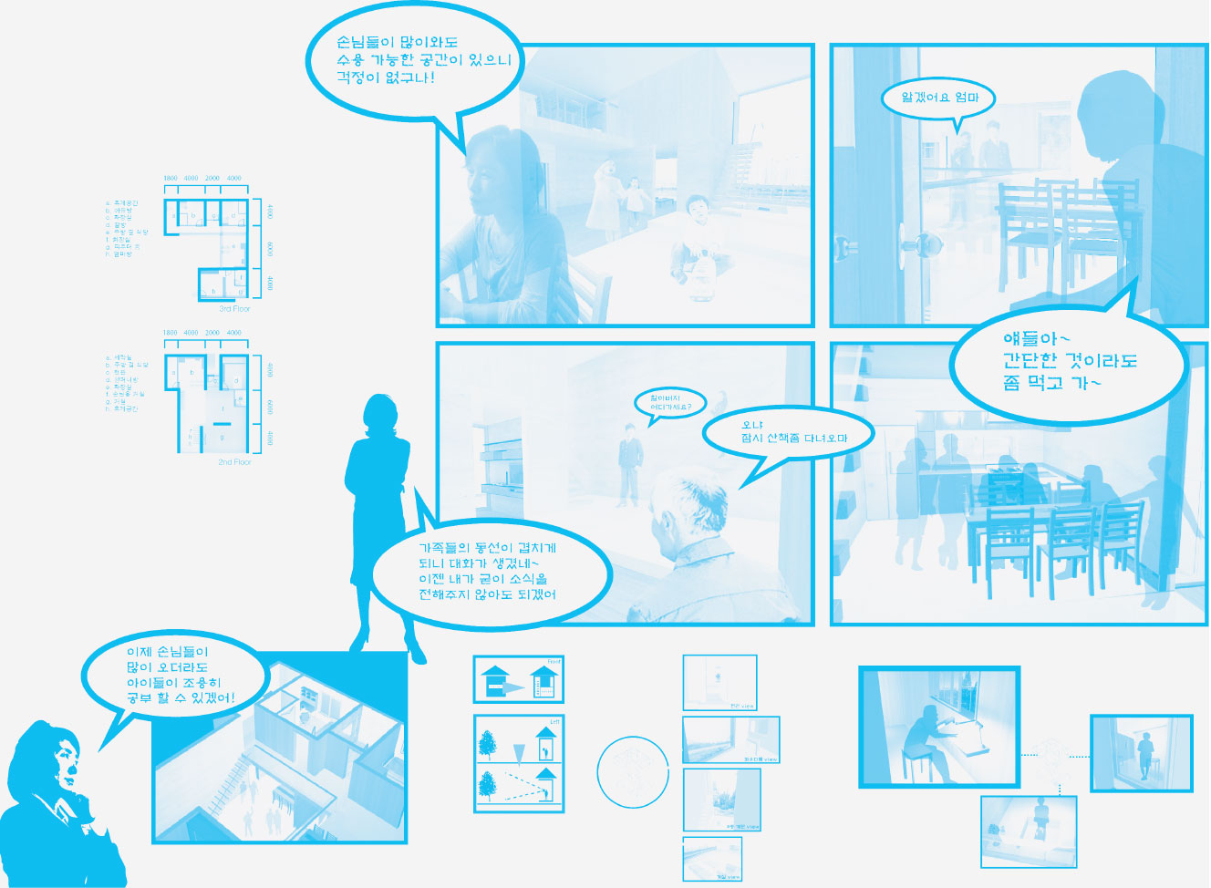 유걸 3세대가 같이 사는 대가족 제도를 수용하는 공간이라는 점에서 가족 구성원간의 관계가 보통 핵가족과 다를 겁니다. 3세대가 살 주거라 하면 지속성에 대해 더욱고민이 필요합니다. 노인이 이용하기에 계단은 어떤지, 노인 분들이 돌아가시고 나면 어떻게 사용될지, 젊은 아이들이 출가하면 어떻게 되는지 등 여러 가지 문제가 복잡하게 얽혀있습니다. 그래서 지금처럼 이 공간을 가장 오래 사용하는 어머니에 포커스를 둔 것이 나쁘지 않습니다. 어머니를 중심으로 한 문제 해결점이 더 잘 보였다면 좋았을 거라 생각합니다.