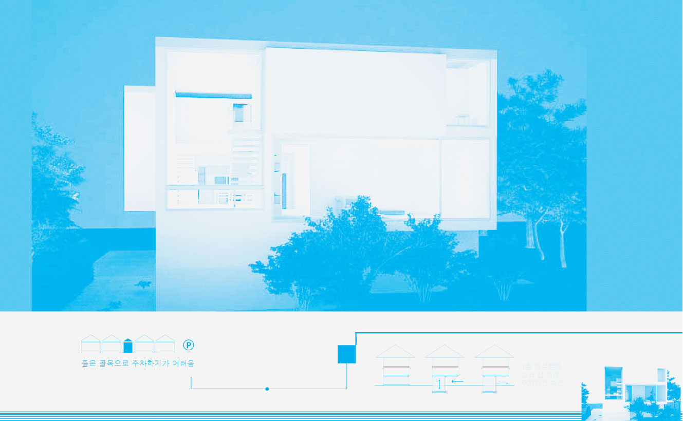 건축주 우선 두 층이 더 편리하게 연결되면 좋겠습니다. 안방이 3층의 안쪽에 있어서 동선이 길기도 하고요. 어떻게 보면 집에서 가장 활동하는 사람이 전데, 집안일을 좀 편하게 하고 싶습니다. 건물 바로 앞에 좋은 공원을 두고 옆집 벽을 바라보고 있는 2층 거실도 문제입니다. 새 집은 햇볕이 잘 들고 공원이 잘 보이는 시원한 공간이길 바라죠. 천장 고도도 높으면 더 좋겠습니다. 반면, 공원을 바라보고 있는 3층 거실은 너무 좁아서 손님을 맞기에 문제가 있습니다. 게다가 수험생인 아이들 방이 거실 겸 부엌 바로 옆에 있어서 손님이 오면 방해가 됩니다. 이점도 우리 집이 가진 문제점 가운데 하나죠. 그리고 낡고 좁은 화장실 대신 넓고 프라이버시를 지킬 화장실, 주차 공간이 있으면 편할 거 같아요. 무엇보다 가족들이 자연스레 모일 공간이 필요합니다.
