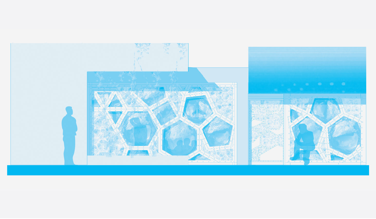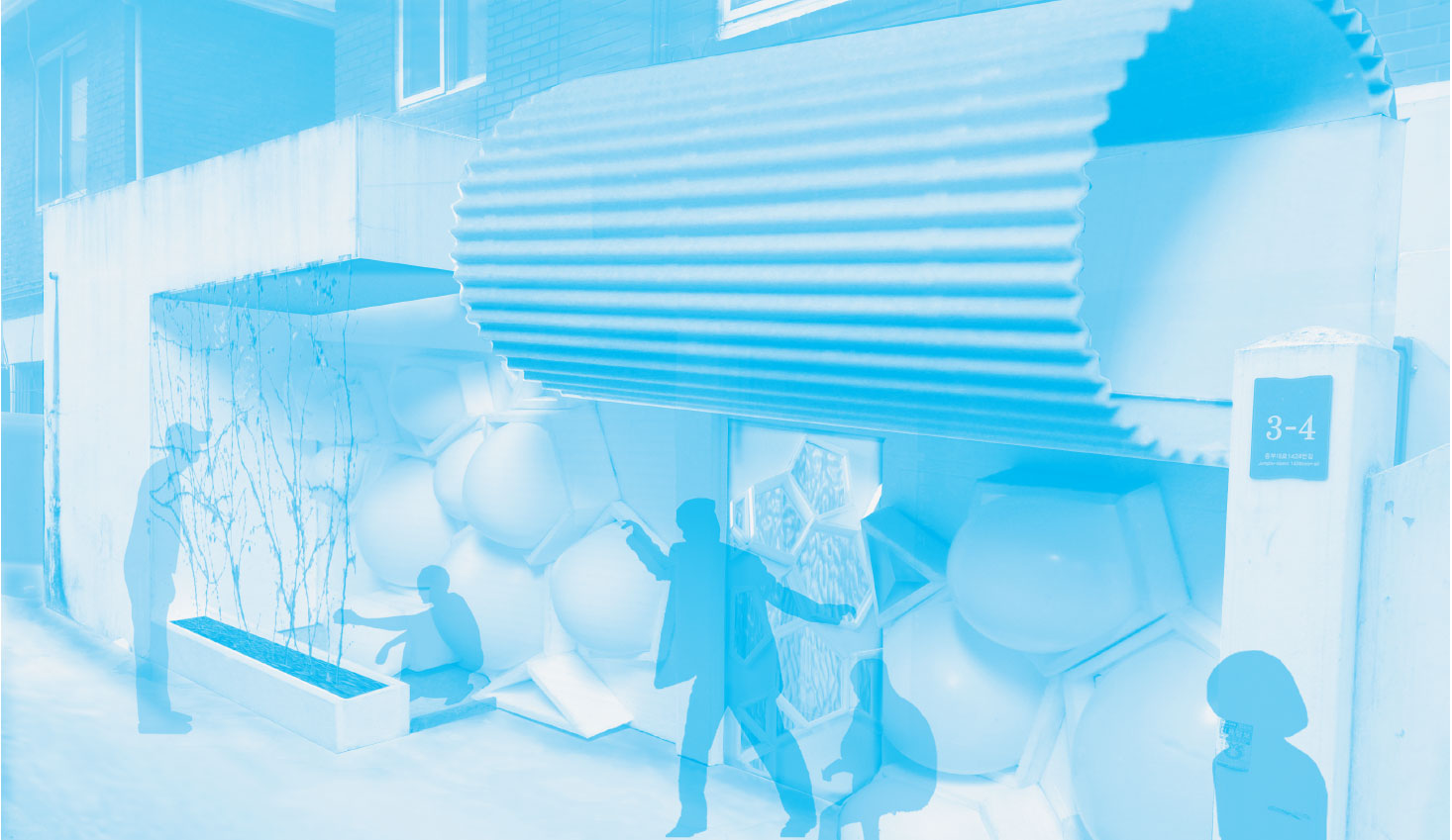 이 텅 빈 공간을 전시공간으로 활용해서 주민들과 소통하고자 했다. 또 쓰레기가 쌓이던 곳에는 화단을 설치해서 ‘깨진 유리창 효과’를 해결하고자 했다. 캐노피가 없는 우측은 낡은 셔터를 둥글게 해서 캐노피를 대신하기로 했다. 여러 형태의 입면 스터디를 거쳐 다양한 도형의 프레임에 거품을 연상시키는 4겹의 공기막 튜브를 설치한 입면을 완성했다. 이번 프로젝트는 거창한 것이 아니었다. 하지만 가장 가까운, 내가 사용하는 공간의 문제를 해결하면서 건축주의 입장이 되어보았다.
