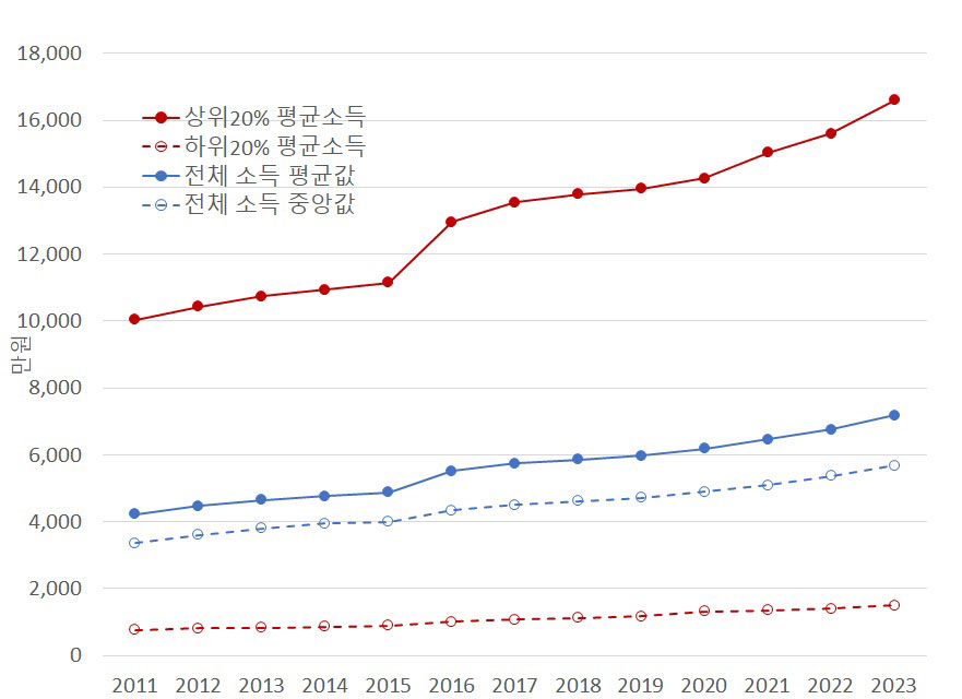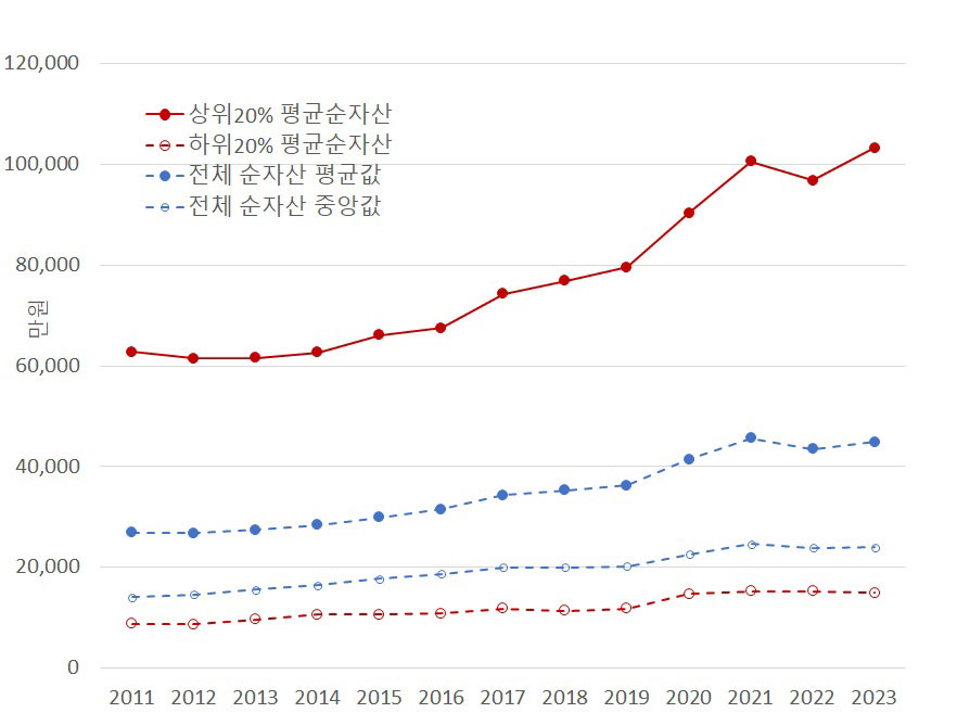 그러나 밝은 뒷면에서 어두운 그림자가 짙어지고 있다. 빠른 성장으로 세계적인 경제 대국이 된 만큼이나 빠르게 불평등한 나라, 빈부격차가 큰 나라가 되어가고 있다. 2023년 한국의 가구당 소득 평균값은 7,185만 원인데 중앙값, 즉 중간 순위 가구의 소득은 5,681만 원이다. 중앙값이 평균값의 79%밖에 안 된다. 그만큼 소득 상위계층과 중하위 계층의 차이가 크다는 얘기다. 보유 자산의 불평등은 더 심하다. 가구당 보유 순자산 중앙값은 2억 3,995만 원으로 평균값 4억 4,894만 원의 53.4%밖에 안 된다. 불평등은 상위 계층과 하위 계층의 격차에서 보다 선명하게 확인된다. 상위 10%의 평균 소득(2억 1,051만 원)이 하위 10% 평균 소득(1,019만 원)의 20.7배이고, 상위 10%의 평균 자산(16억 2,895만 원)은 하위 10% 평균 자산(1억 2,803만 원)의 12.7배다. 그래프에서 상위 계층과 하위계층의 소득과 자산 모두 그 격차가 점점 커지고 있음을 확인할 수 있다.