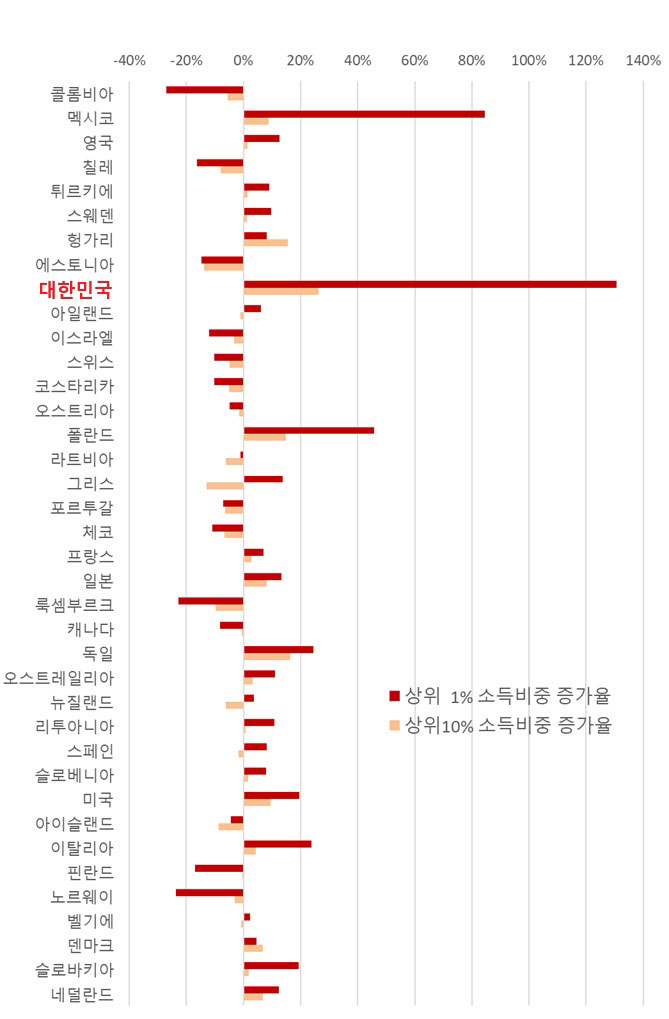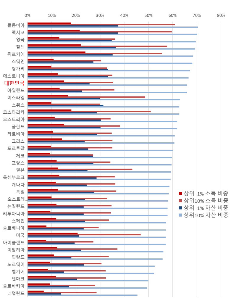 물론 한국보다 불평등이 심한 나라도 많다. 한국의 지니계수가 0.35 수준인데 아프리카나 중동, 남아메리카 등에는 0.5에 달하는 나라도 적지 않다. 프랑스의 세계불평등연구소(World Inequality Lab)가 홈페이지를 통해 공개하고 있는 데이터를 OECD 국가들로 한정하여 보면, 상위 10% 계층의 소득 비중과 자산 비중에서 한국은 OECD 38개국 중 각각 16위, 9위이고, 상위 1%의 소득 비중과 자산 비중은 각각 9위, 19위다. 소득과 자산 불평등 모두 중간보다 약간 심한 정도다. 그런데 정작 문제는 불평등이 심해지는 속도다. 한국의 불평등 증가 속도는 압축성장만큼이나 빠르다. 2000~2023 기간에 상위 1% 계층과 10% 계층 모두 소득 비중 증가율이 38개국 중 1위다. 상위 1%의 소득 비중이 37위(2000)에서 9위(2023)로 뛰어올랐고, 상위 10%의 소득 비중은 36위(2000)에서 16위(2023)로 올랐다. 자산 비중 증가율 역시 모두 10위권이다. 이런 추세라면 한국은 머지않아 세계에서 가장 불평등이 심한 나라가 될 것이라고 예상할 수 있다.