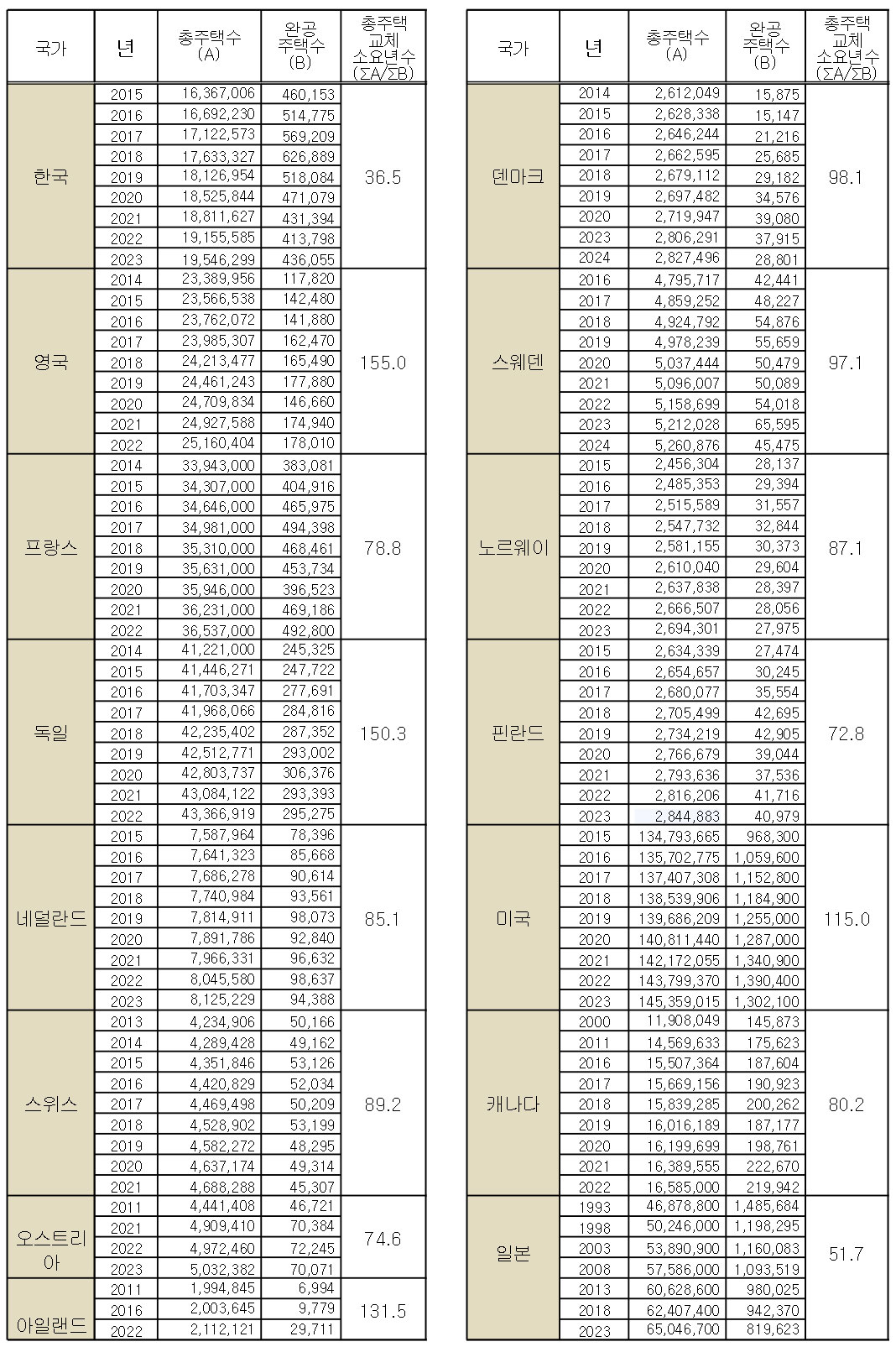그렇다면 “유럽 국가들에서 건축물을 100년 이상 사용하는 것이 보통”이라는 것도 사실일까? 각국의 건축물 수명이 통계로 발표되지 않으므로 이를 직접적으로 확인할 수는 없다. 유사한 통계 수치를 이용하여 추정하는 수밖에 없다. [표 1-1]은 각국의 주택 통계를 뒤져서 연도별 총 주택 수를 그 해 건설한 주택 수로 나누어 ‘총 주택 교체 소요년수’를 계산한 것이다. 매년 같은 수의 주택을 건설한다면 몇 년 만에 총 주택에 해당하는 양의 주택이 새로 지어지는지 계산하고 이를 그 나라의 건축물 평균 수명으로 추정하려는 것이다. 각국이 공표하는 통계 중 가용한 범위에서 최근 7~9개년의 통계를 찾아 평균값을 계산했다. 물론 이러한 추정에는 오차가 있겠지만, 조사 대상 국가들이 모두 오래전에 주택보급률 100%를 넘은 나라들이어서 총주택 수나 신축 주택 수가 큰 변화 없이 일정한 흐름을 유지하므로 그 오차 정도는 그리 크지 않을 것이다. 따라서 이렇게 계산된 ‘총 주택 교체 소요년수’를 주택 평균 수명으로 보고 이를 그 나라의 건축물 평균 수명으로 간주해도 크게 무리하지 않을 것이다.
