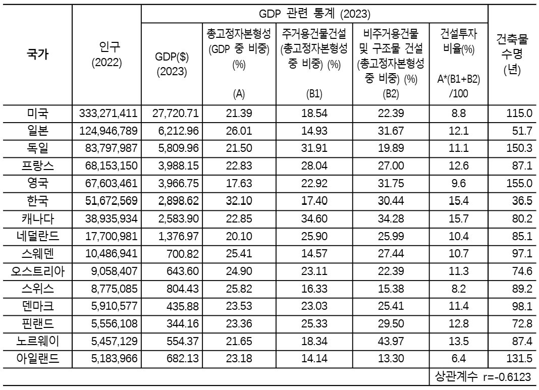 [표 1-3] 국가별 건설투자비율과 건축물 수명 (*자료: OECD data)