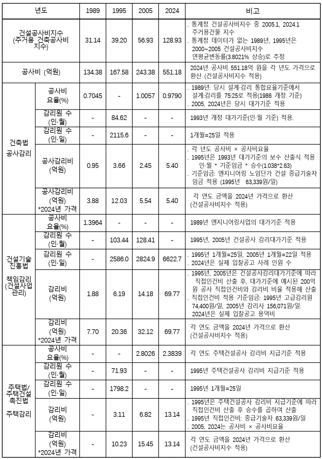 2024년은 실제 공고된 공사비(공사예정금액), 감리비(용역예정금액), 감리인원을 그대로 사용하였고 1989년, 1995년, 2005년은 통계청이 공포하는 건설공사비지수 중 주거용건축공사비지수를 사용하여 2024년 공사비를 각 연도 공사비로 환산하고1 여기에 당해 연도 대가기준을 적용하여 감리비를 산출했다.