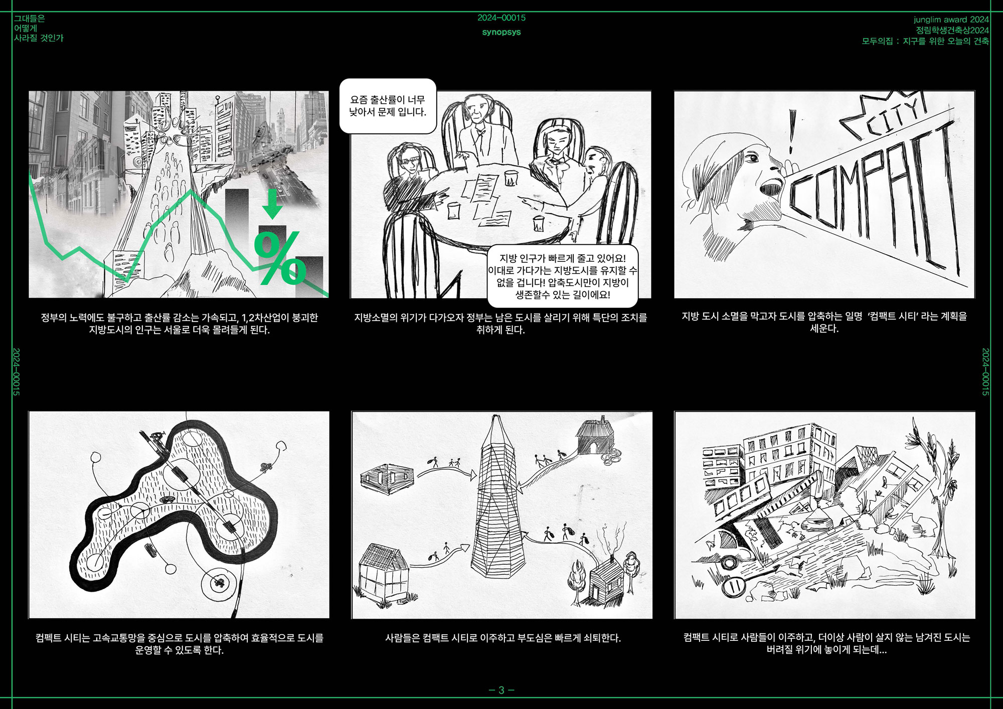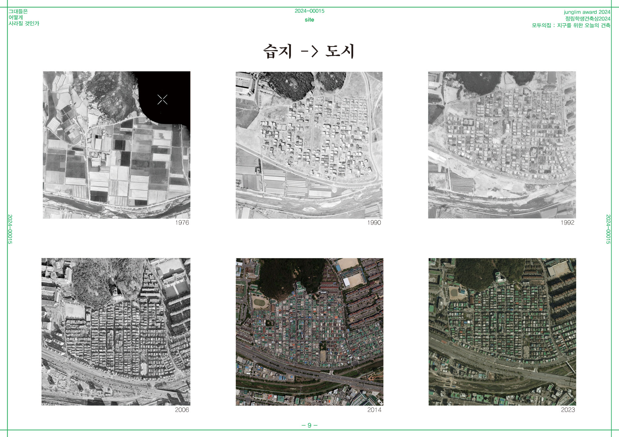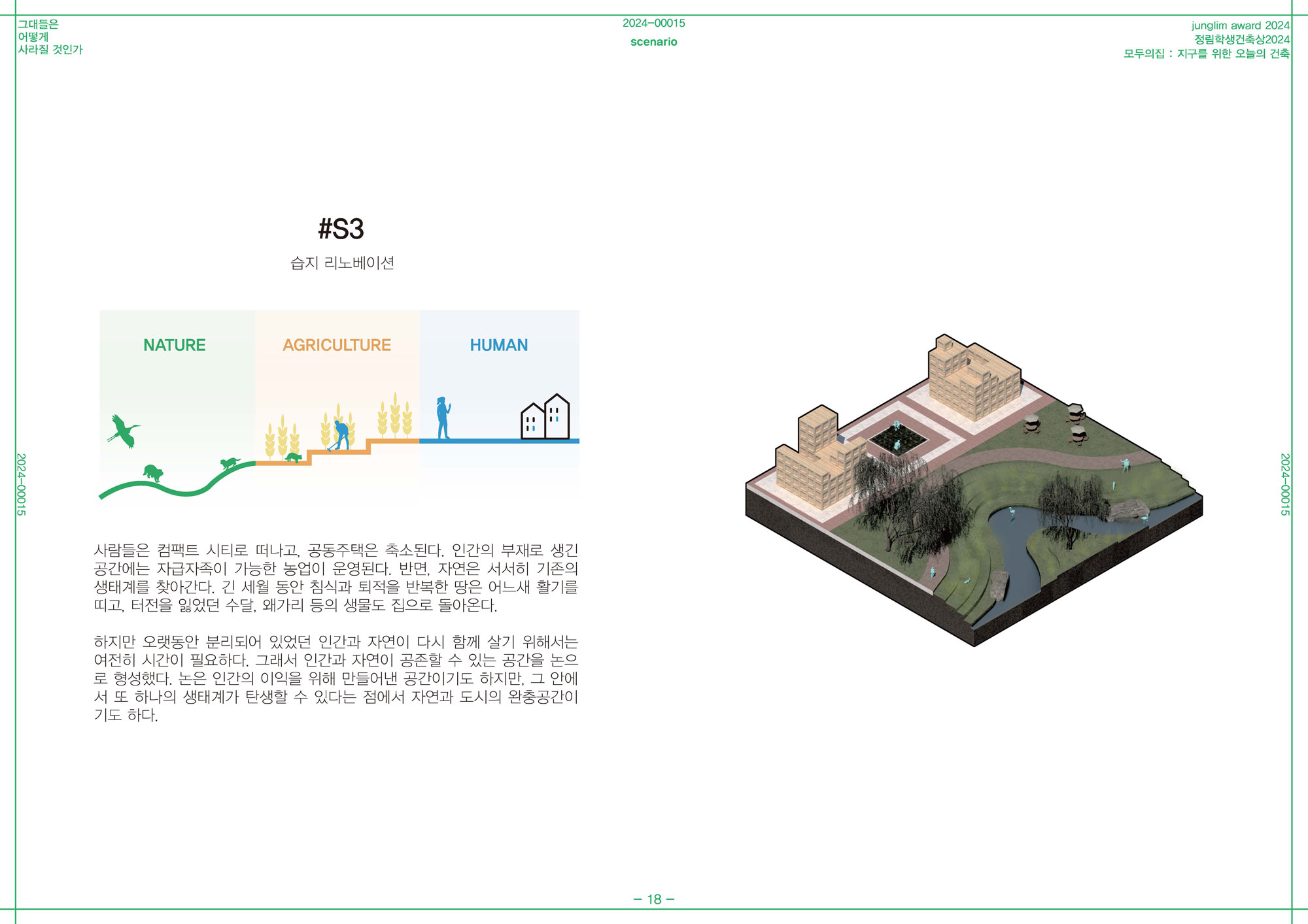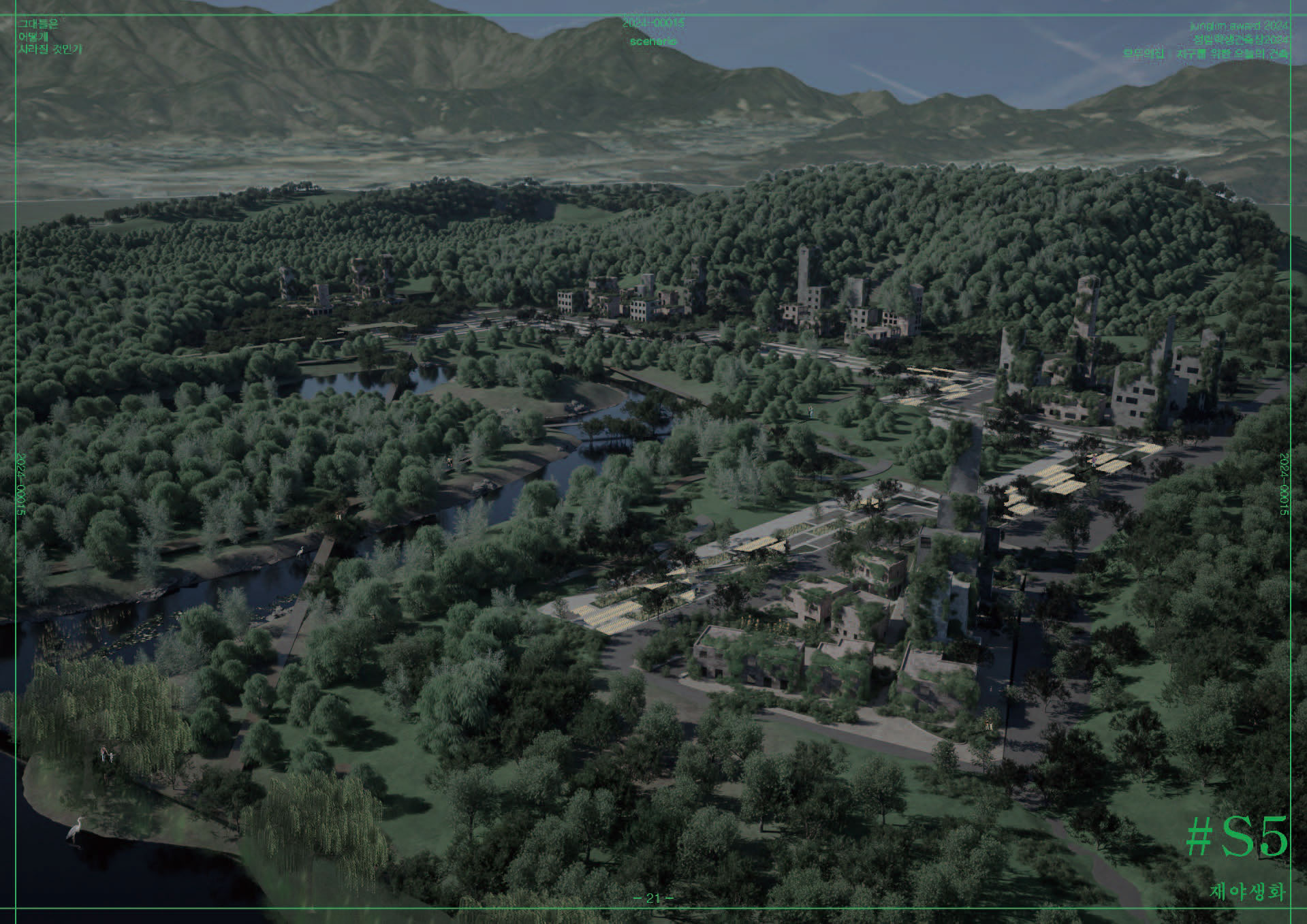 기존의 고속철도망을 활용한 ‘압축도시’의 개념을 바탕으로, 대전이 다시 대전역 주변으로 축소하게 되는 미래를 상상해본다. 대상지인 유성구에 더 이상 사람이 살지 않으면 어떻게 변할까? 인간이 사라지고 버려진 도시는 스스로 본래의 모습으로 돌아갈 수 없다. 대전이 다시 ‘습지’가 되고 기존의 생태계가 되돌아오기 위해서는 인간의 개입이 필요하다.
