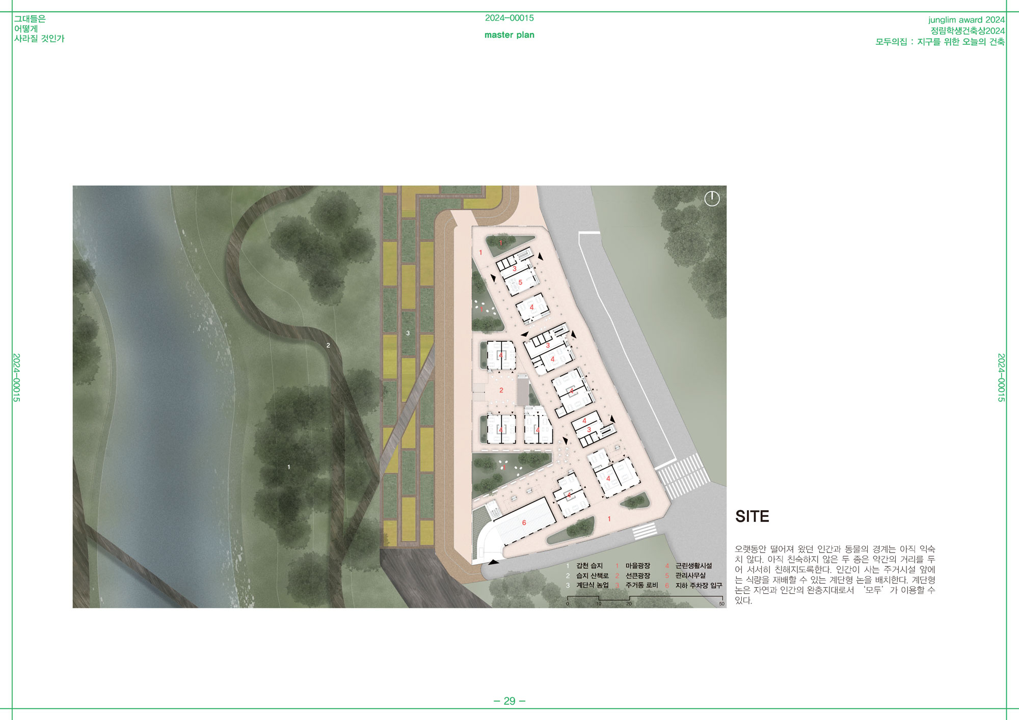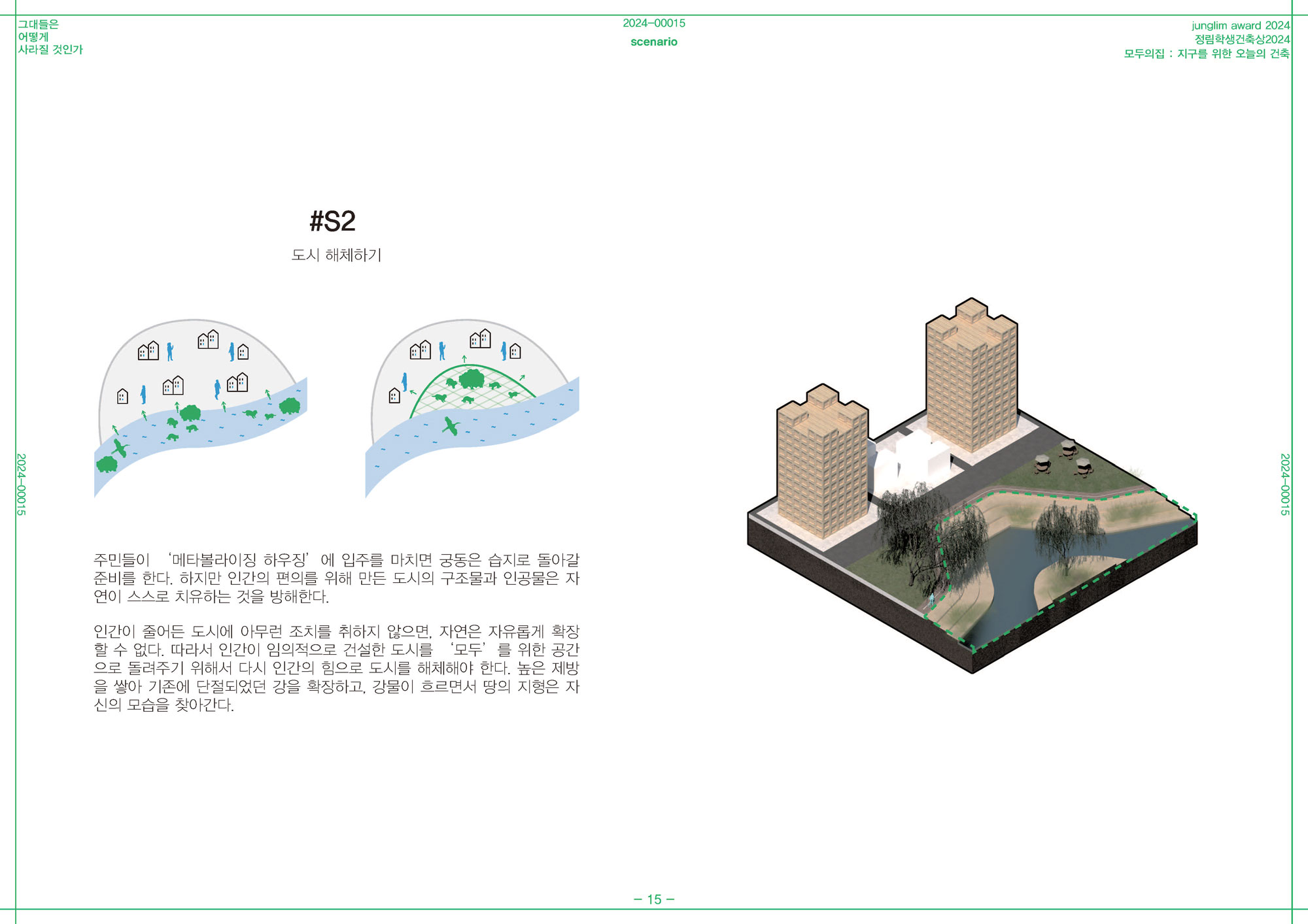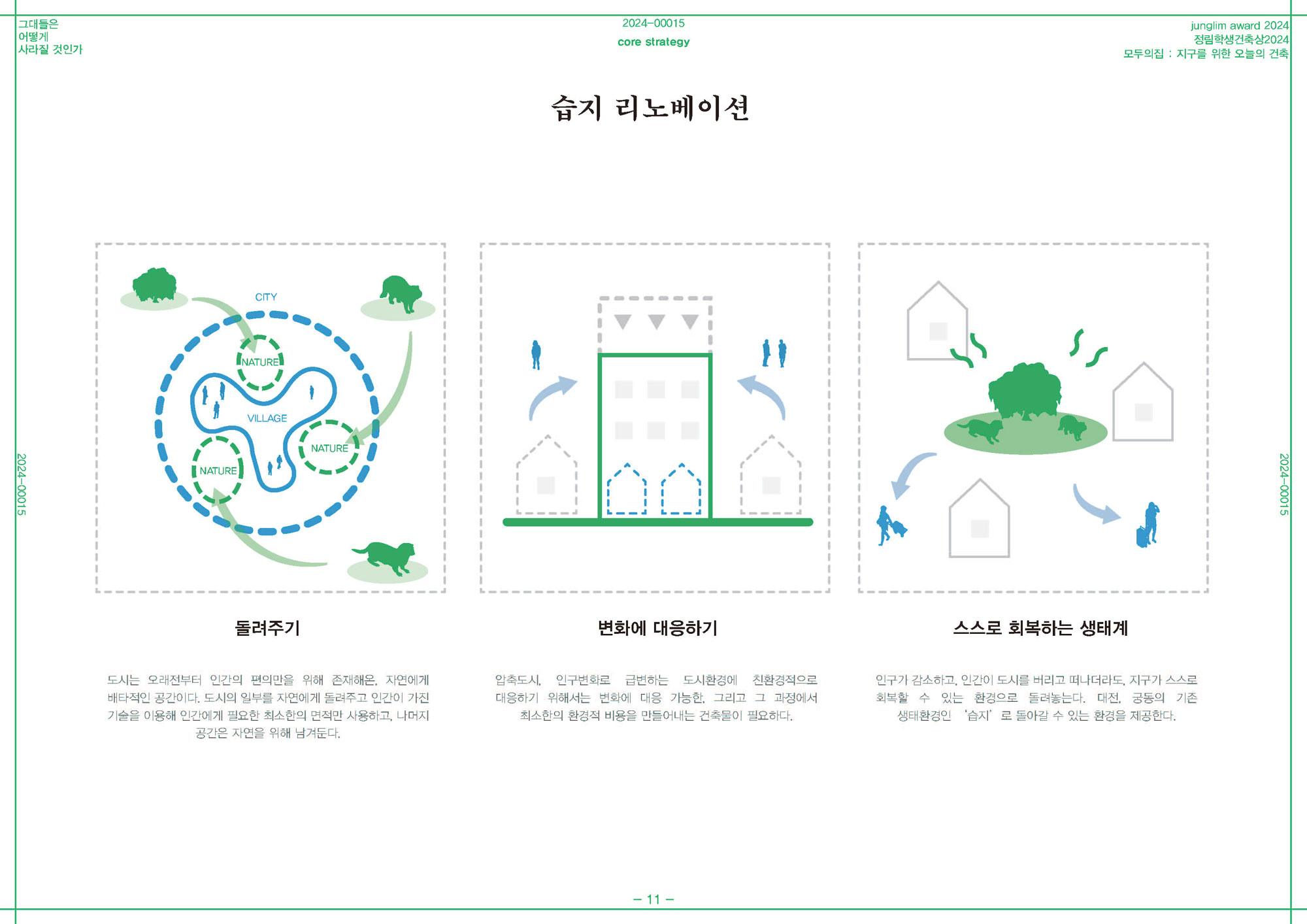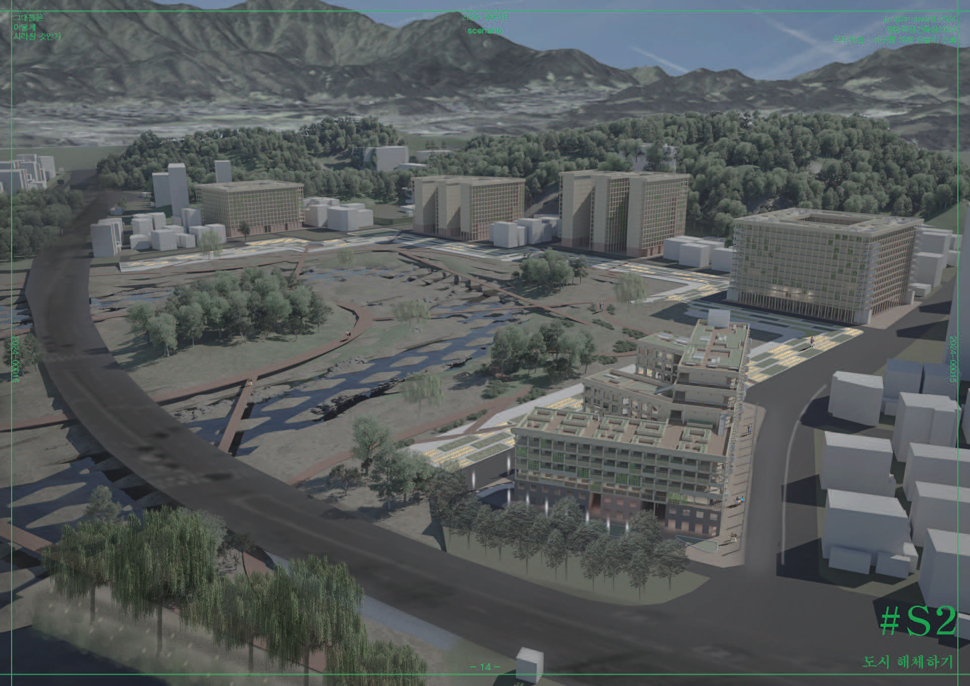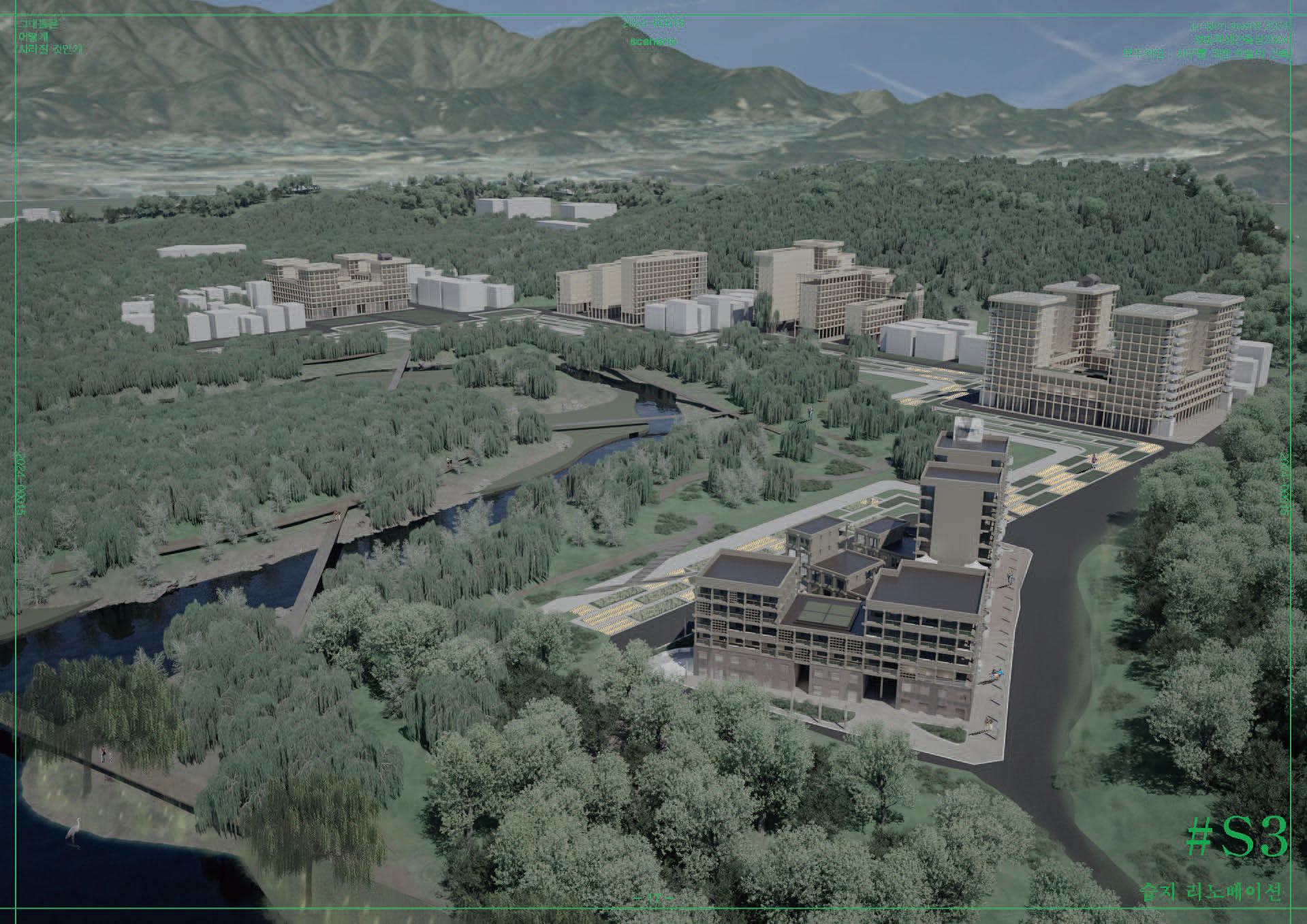 우리는 대전을 기존의 생태환경인 ‘습지’로 돌려주는 ‘습지 레노베이션’을 궁동에 제안한다. 그러기 위해서는 첫 번째로 도시의 일부를 자연에 돌려주고 인간이 가진 기술을 이용해 인간에게 필요한 최소한의 면적만 사용하고, 나머지 공간은 자연에 돌려주는 ‘돌려주기’ 전략이 필요하다. 다음은 인구변화에 대응이 가능한 ‘메타볼라이징 하우징’이 필요하다. 결과적으로 인간이 떠나도 스스로 회복할 수 있는 생태계를 구축하는 것이 이번 프로젝트의 최종목표이다.