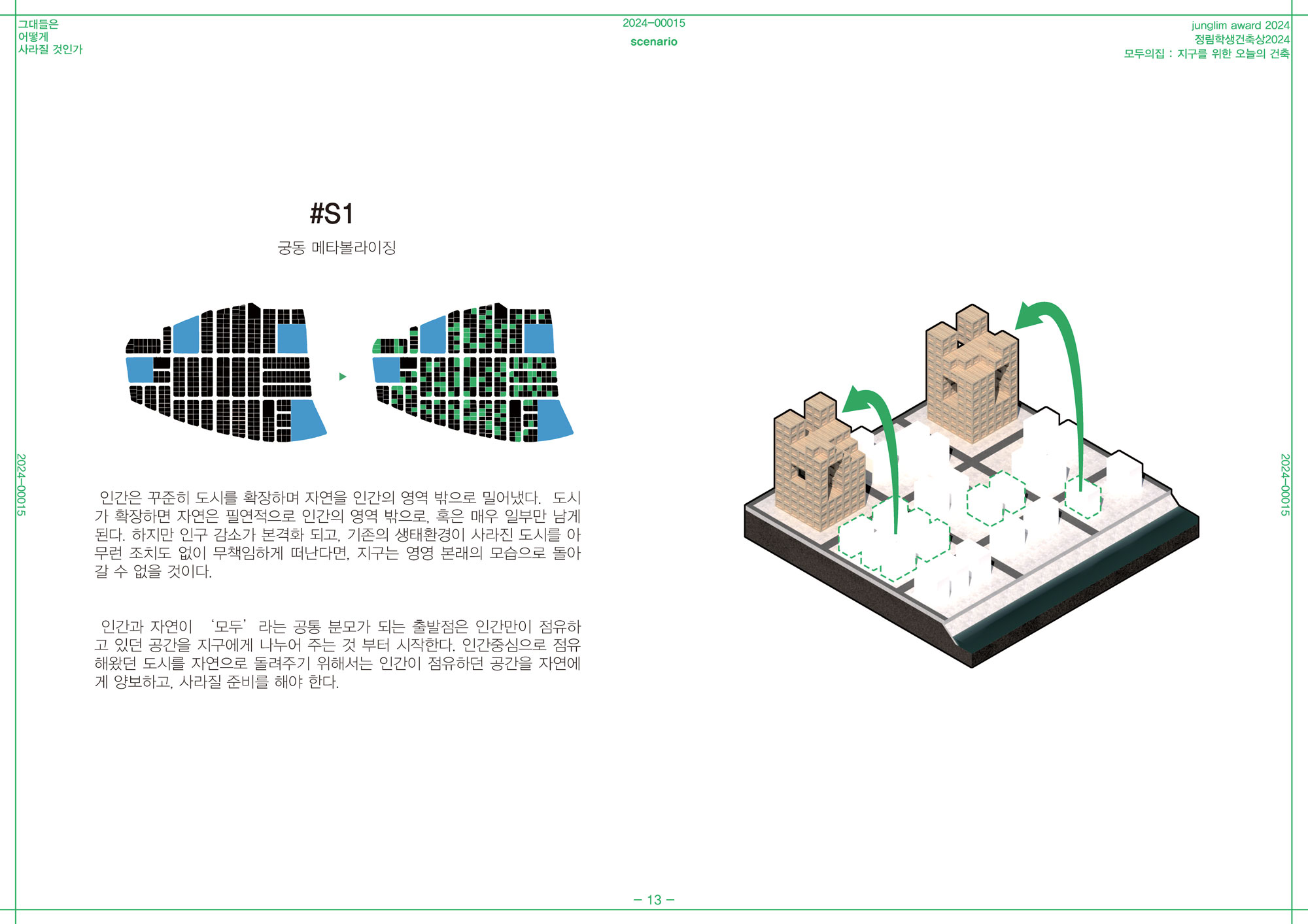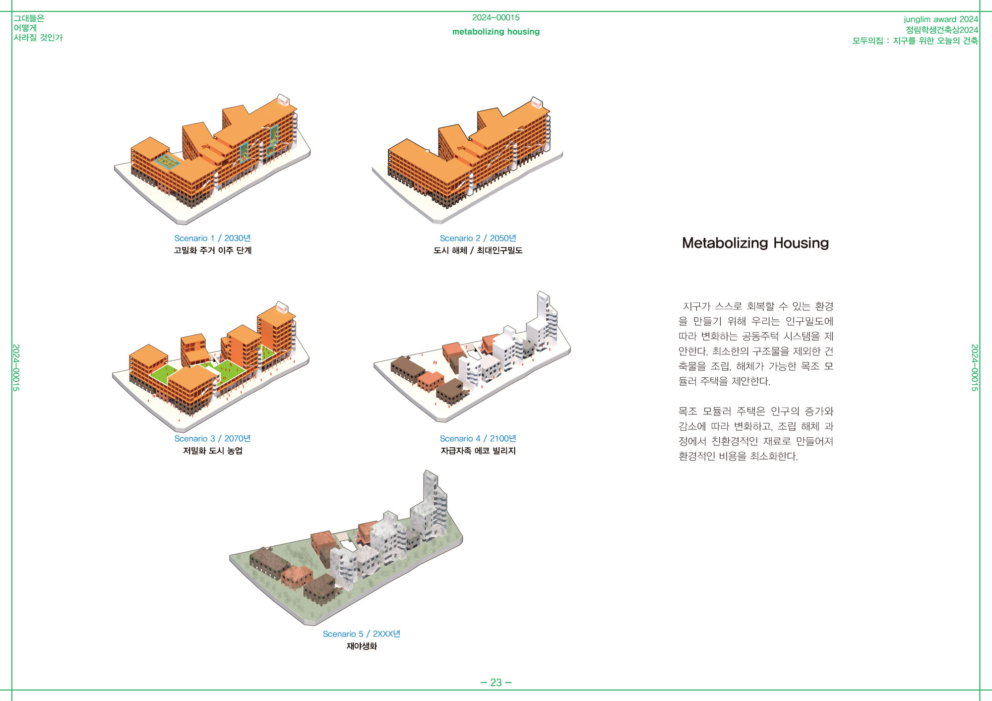 그어사 자연이 리와일딩을 진행하기 위해서는 인간이 자리를 비켜줘야 한다. 인간은 지금 충분히 밀도높은 생활을 할 기술력을 갖췄다. 그렇기 때문에 그동안 인간이 점유했던 도시라는 공간을 내어주는 것이 시급하다. 그런 요소로서 메타볼라이징 하우징을 제안했다.
