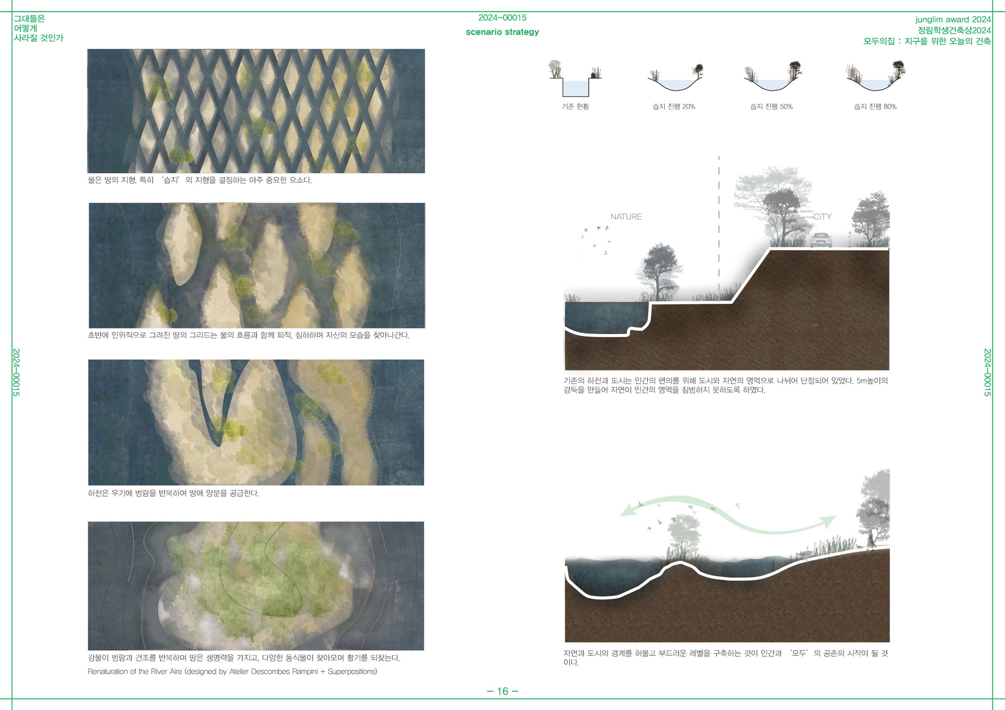 그어사 강의 길을 새로 만들어주는 프로젝트인 스위스 제네바의 리버 아이어(River Aire)를 많이 참고했다. 인간이 만든 그리드 체계에서 물줄기가 흐르고 퇴적과 침식을 거치며 자연스럽게 본연의 모습을 찾아가는 점이 흥미로웠다. 그래서 프로젝트에 그런 부분을 적용하였다.