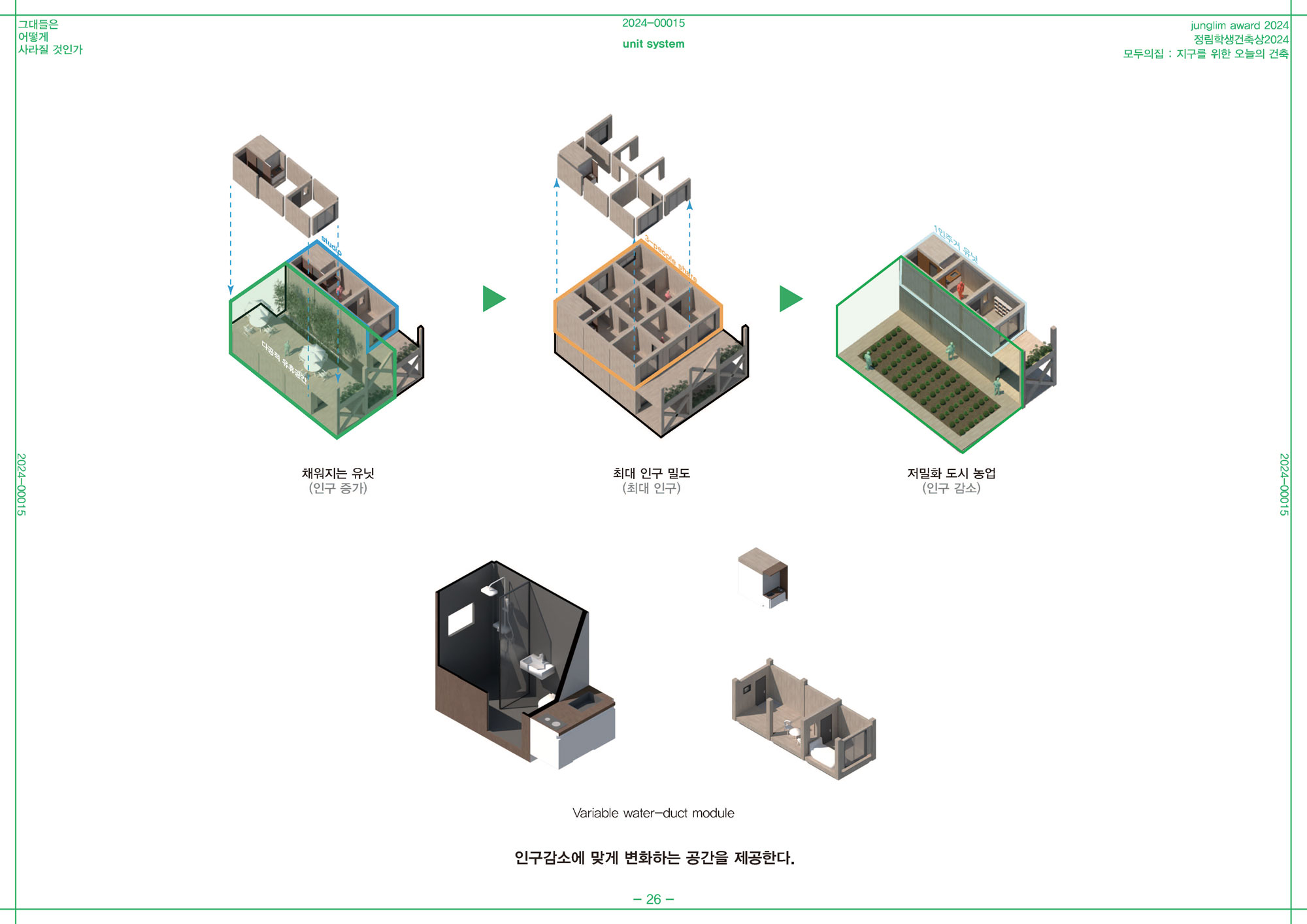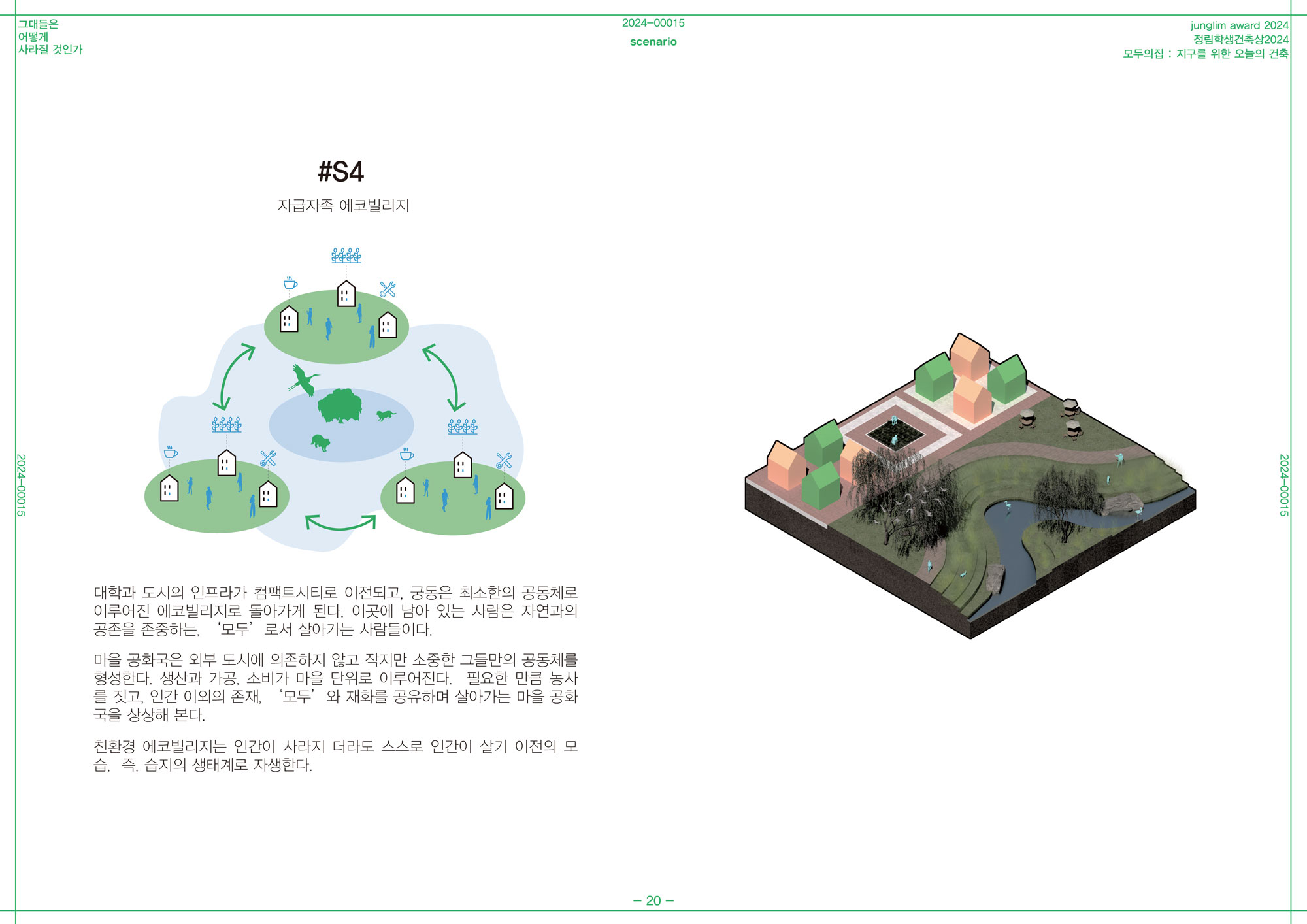 김정임 다이어그램으로 표현한 목조 시스템의 단계별 변화를 봤을 때, 3단계에서 5단계로 나아가는 부분에서 목조 구조가 줄어들고 그 자리에 콘크리트로 지은 듯한 새 건물이 있다. 이 부분은 개념적인 아이디어인지, 자급자족 에코 빌리지와 같은 새로운 형태의 구조물인지 설명해 달라.