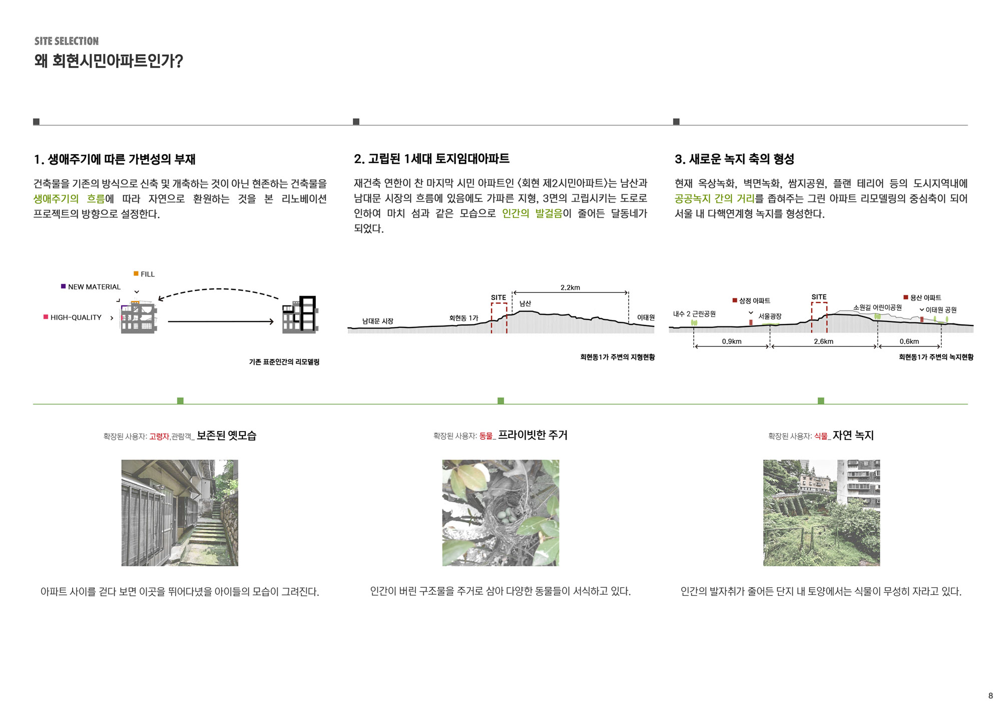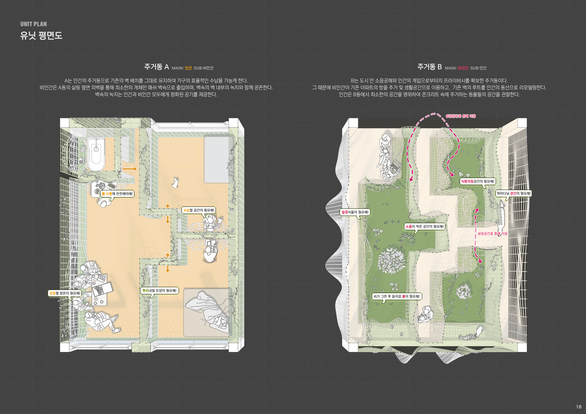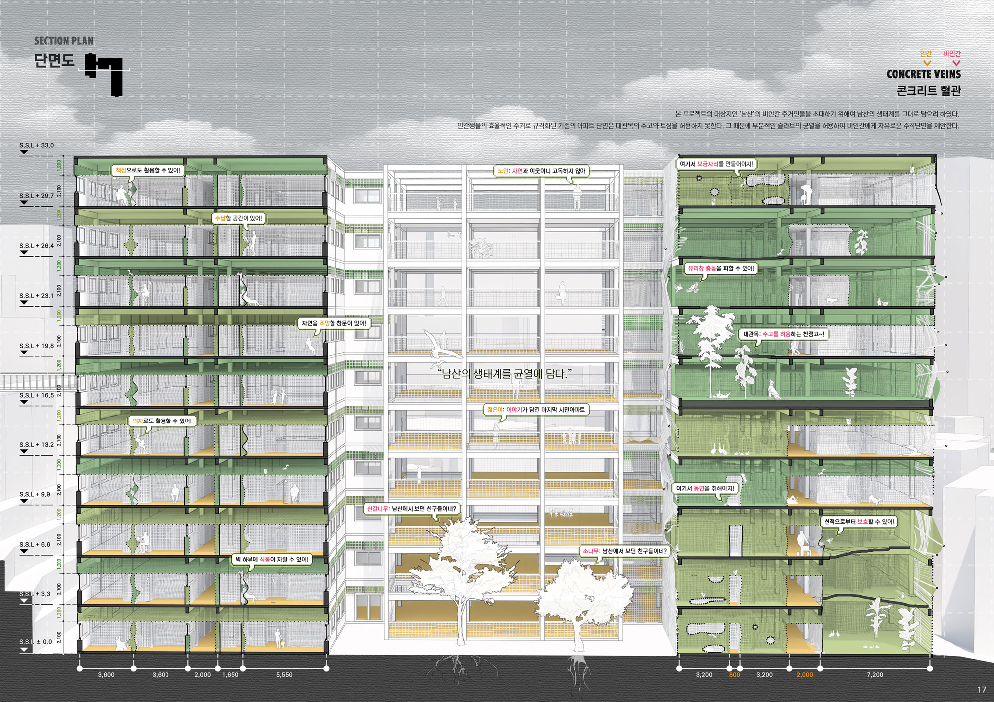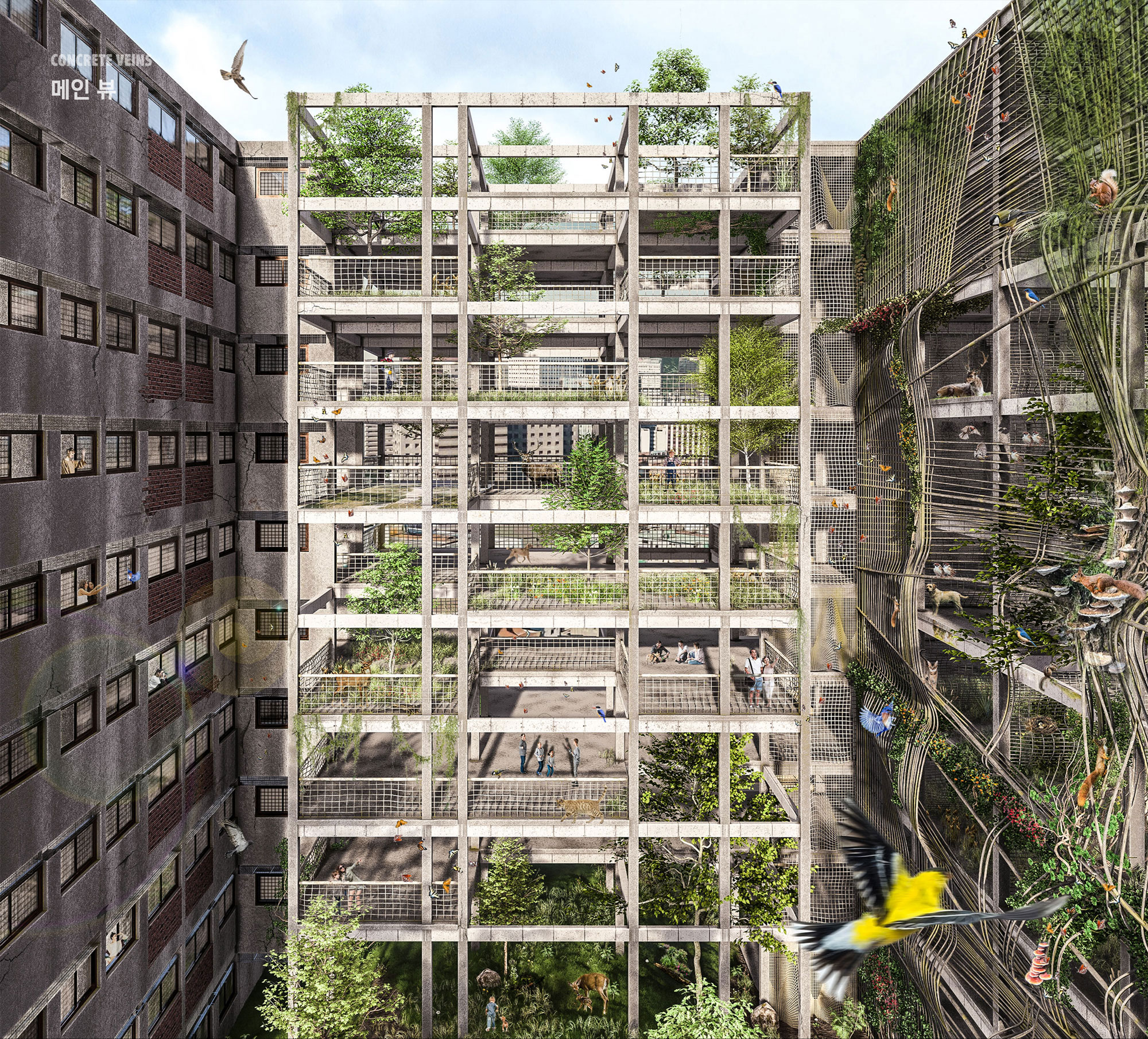 수직적으로는 교목의 수고, 조류의 비행공간, 양서류의 서식공간 등 각 생물의 스케일을 고려한 공간을 제공하기 위해 슬라브 일부를 철거하여 기존 아파트의 표준층고 한계를 극복한다. 이렇게 철거된 비내력벽과 슬라브는 비인간의 수직 동선을 형성하며, 회현동과 남산을 연결하여 도시의 리와일딩을 시작할 가능성을 제시한다.